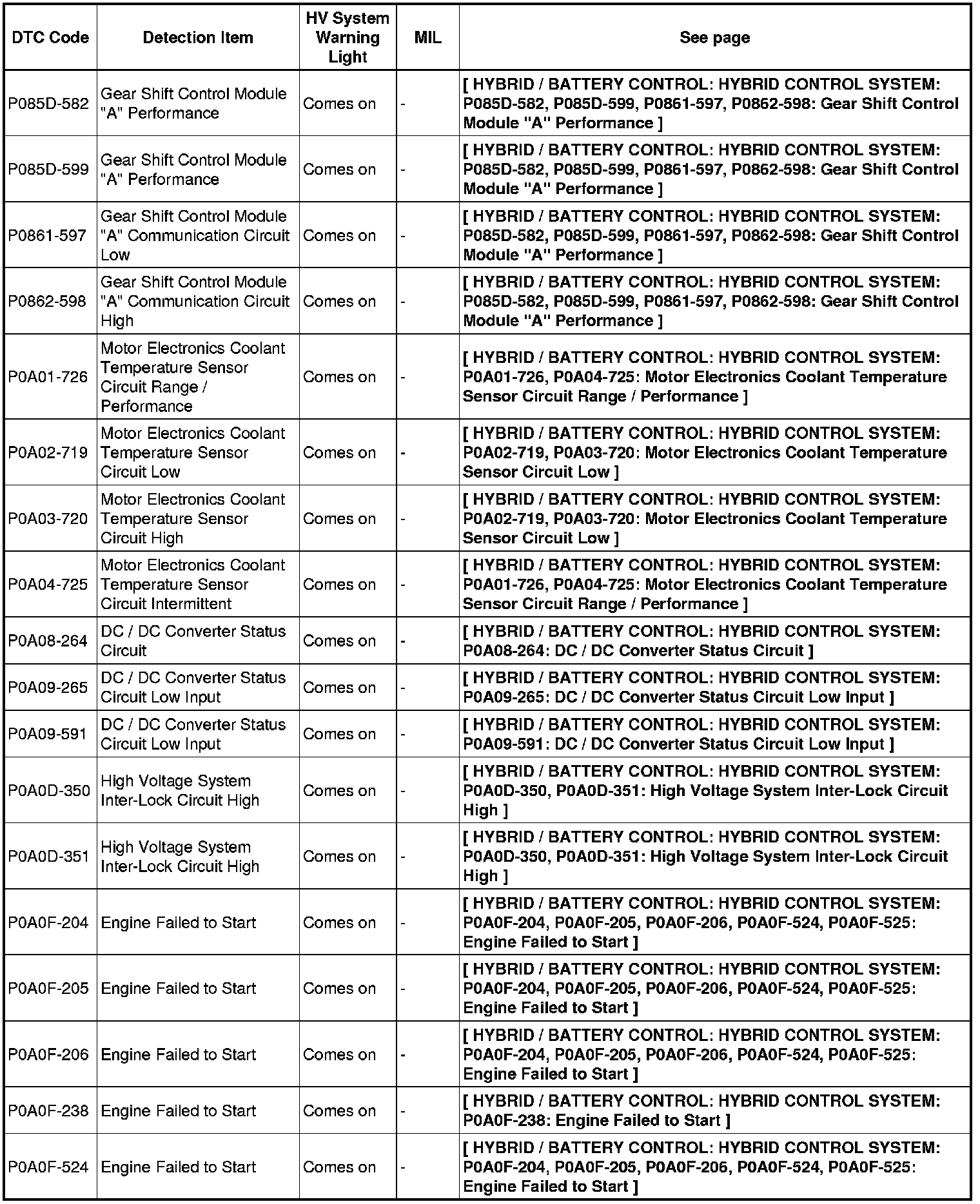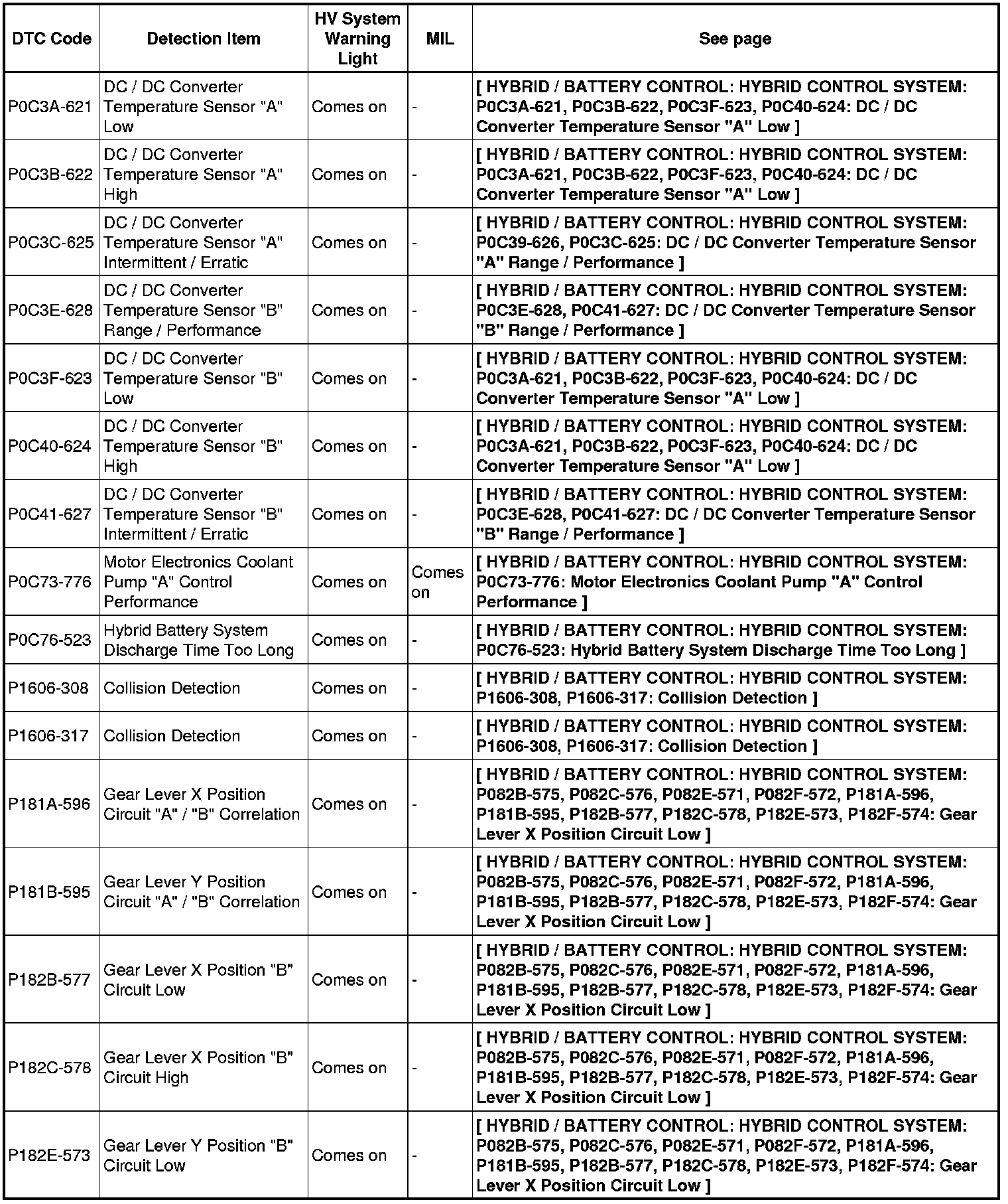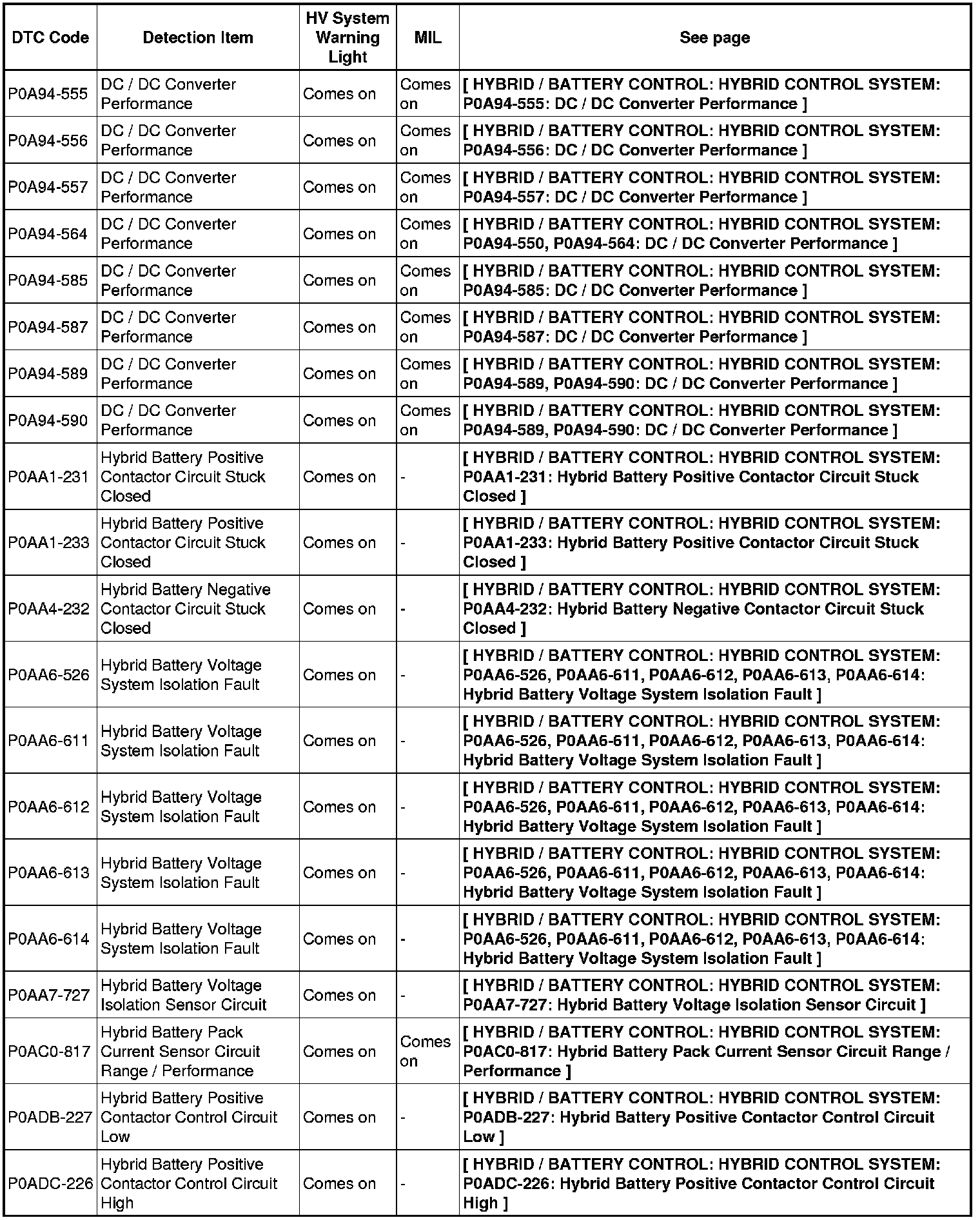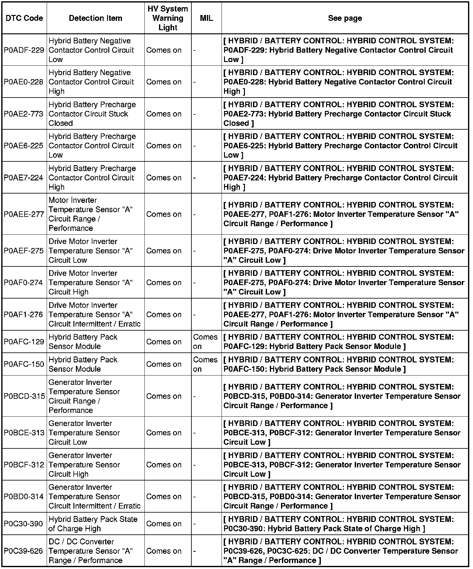 HYBRID / BATTERY CONTROL: HYBRID CONTROL SYSTEM: DIAGNOSTIC TROUBLE CODE CHART