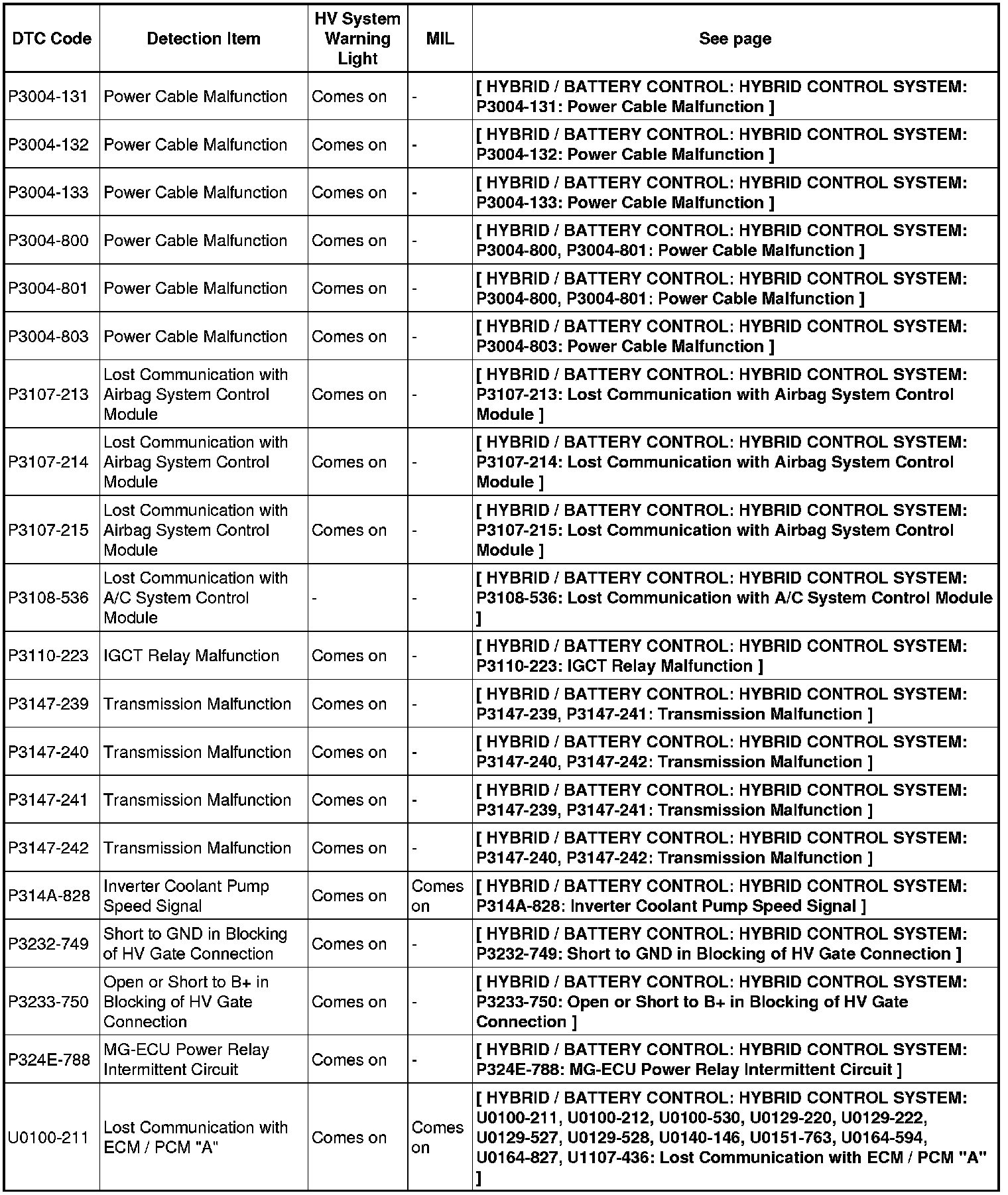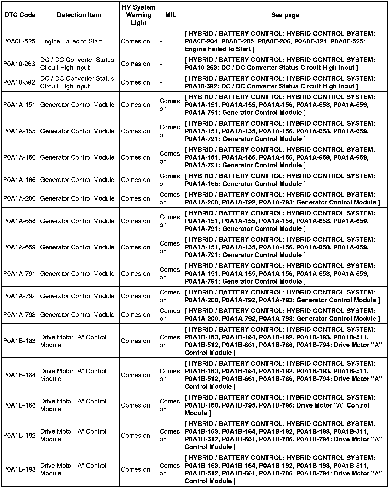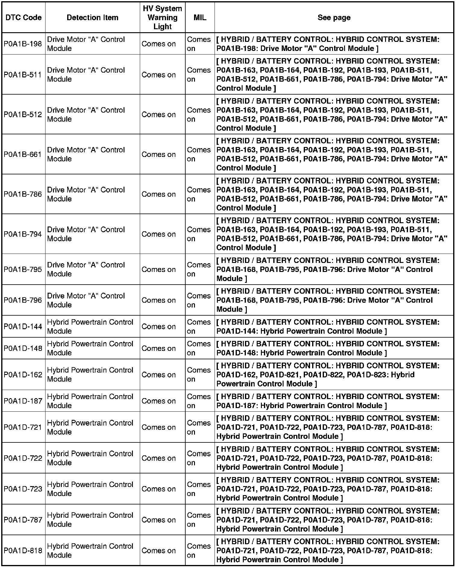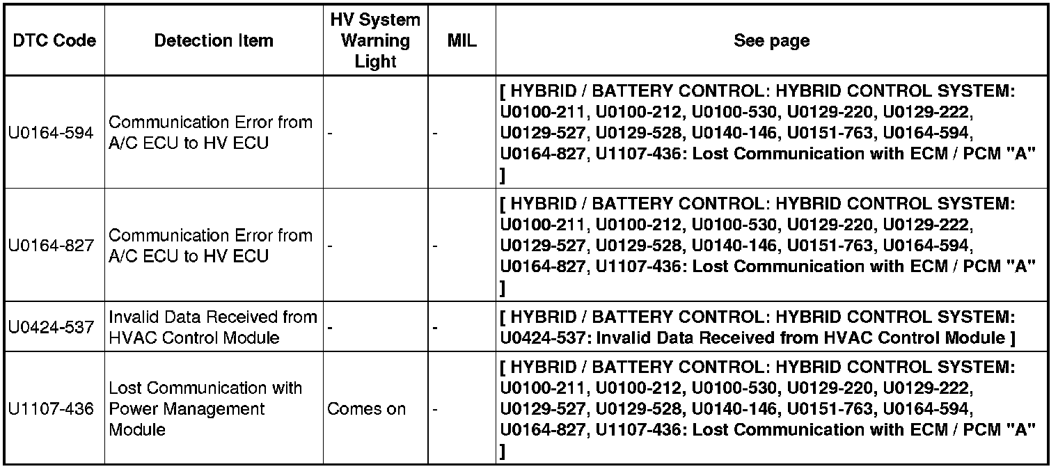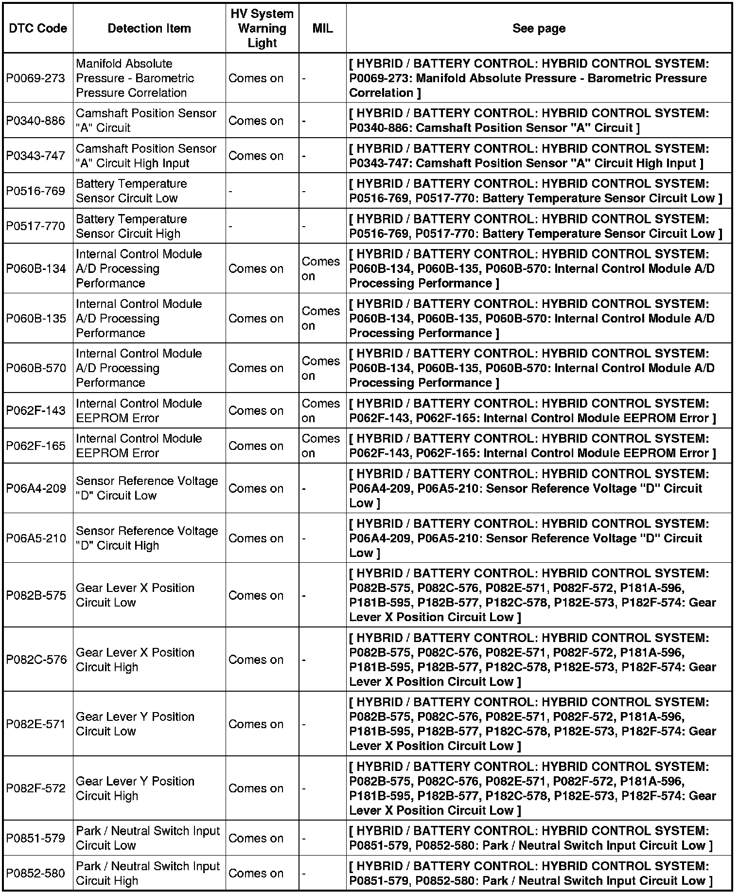 HYBRID / BATTERY CONTROL: HYBRID CONTROL SYSTEM: DIAGNOSTIC TROUBLE CODE CHART