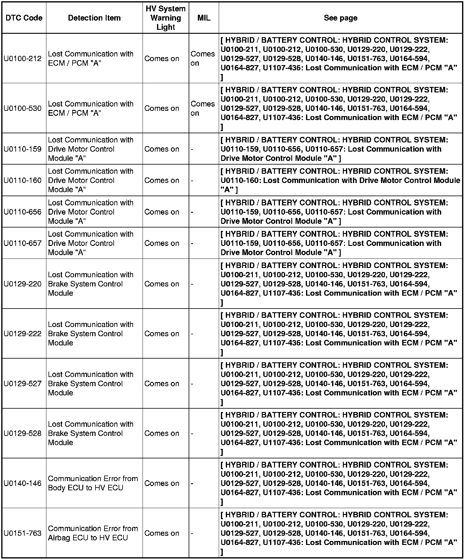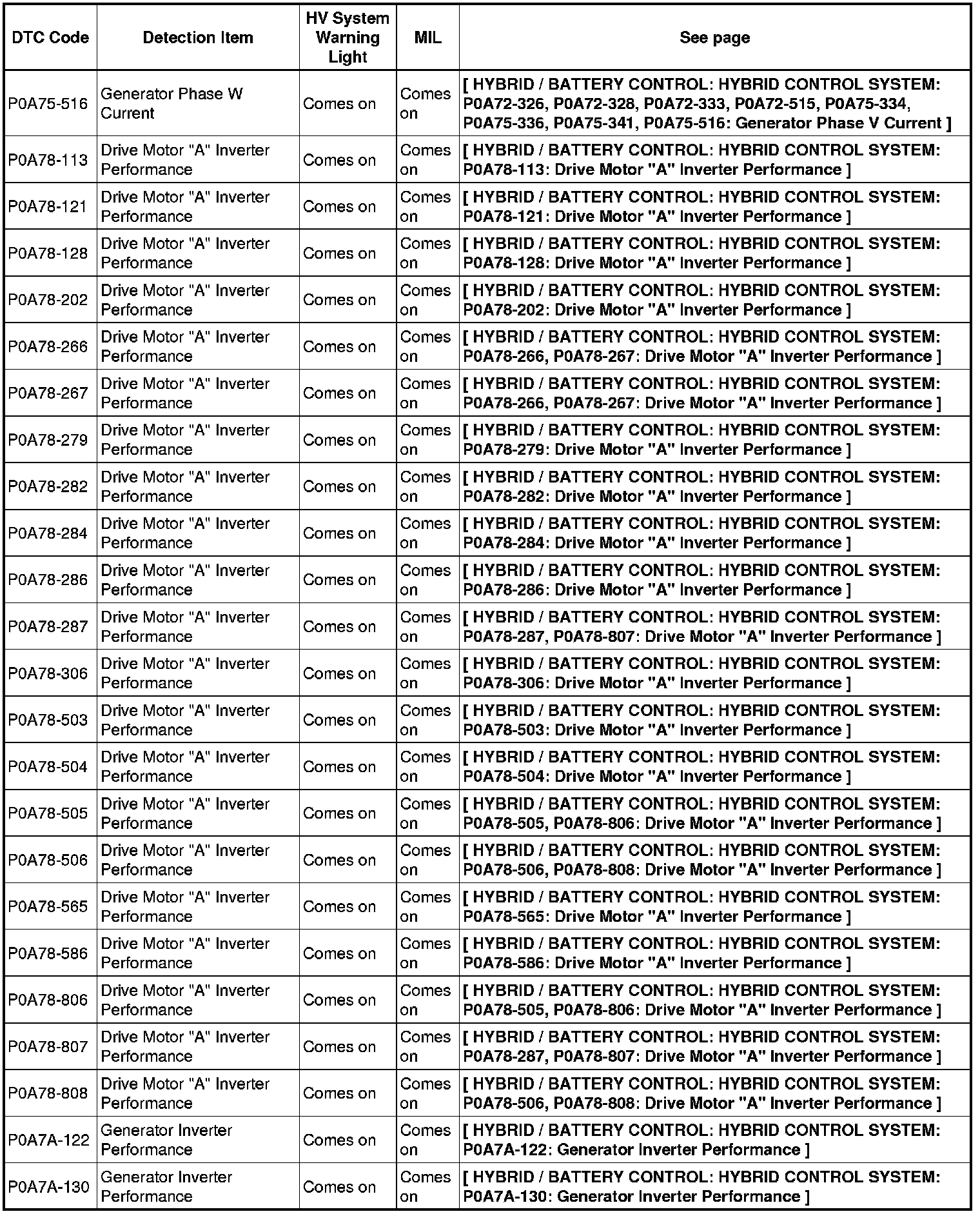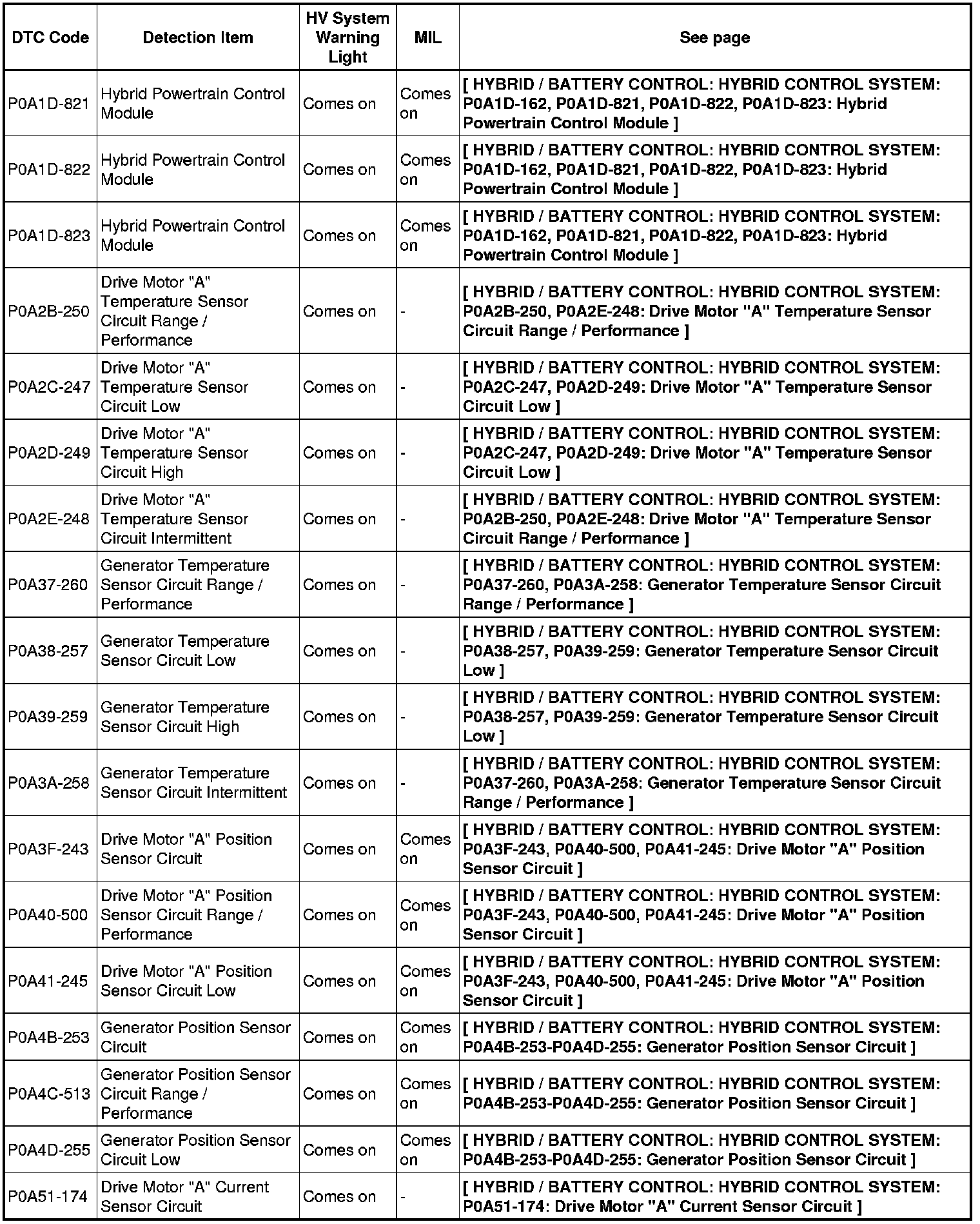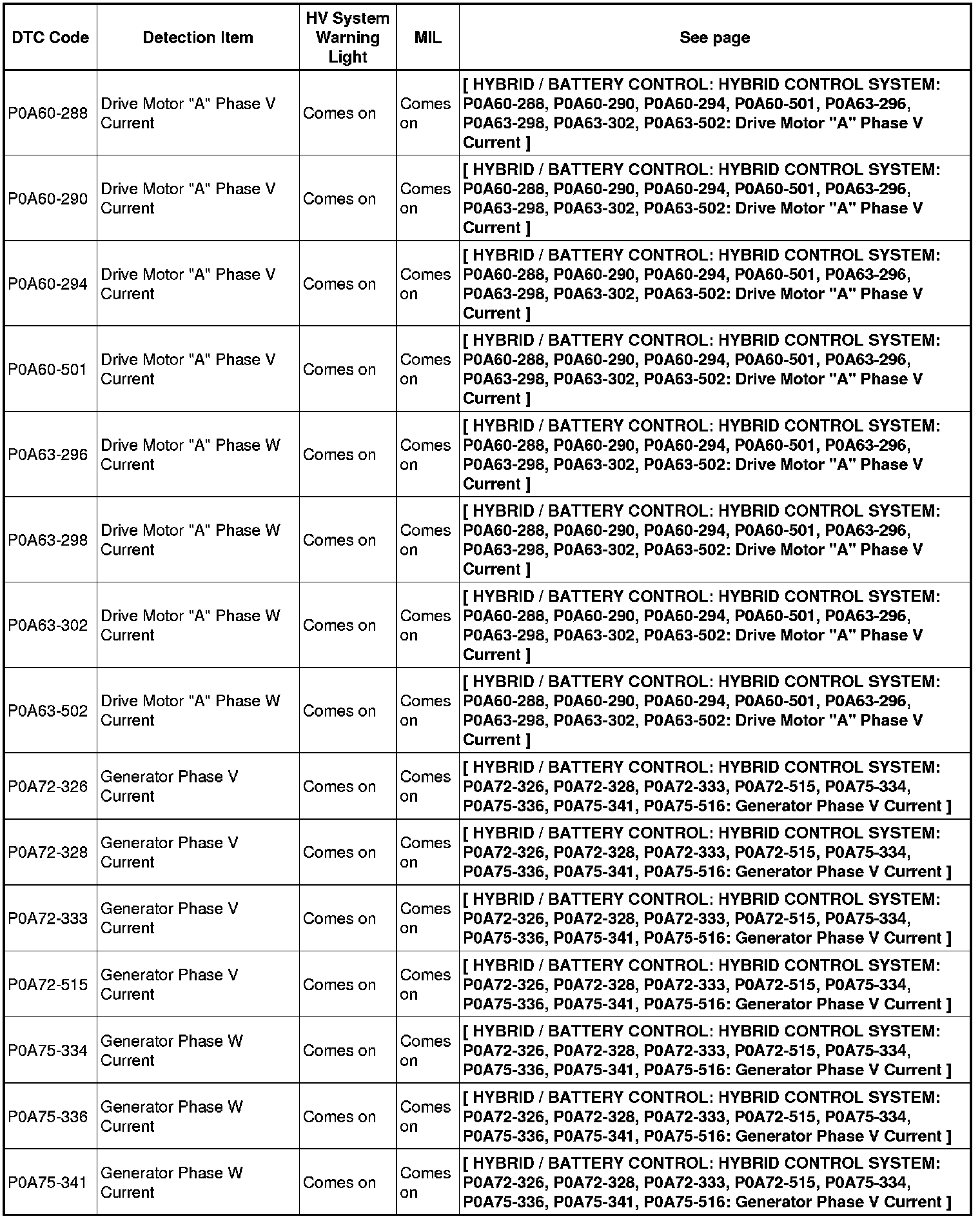 HYBRID / BATTERY CONTROL: HYBRID CONTROL SYSTEM: DIAGNOSTIC TROUBLE CODE CHART