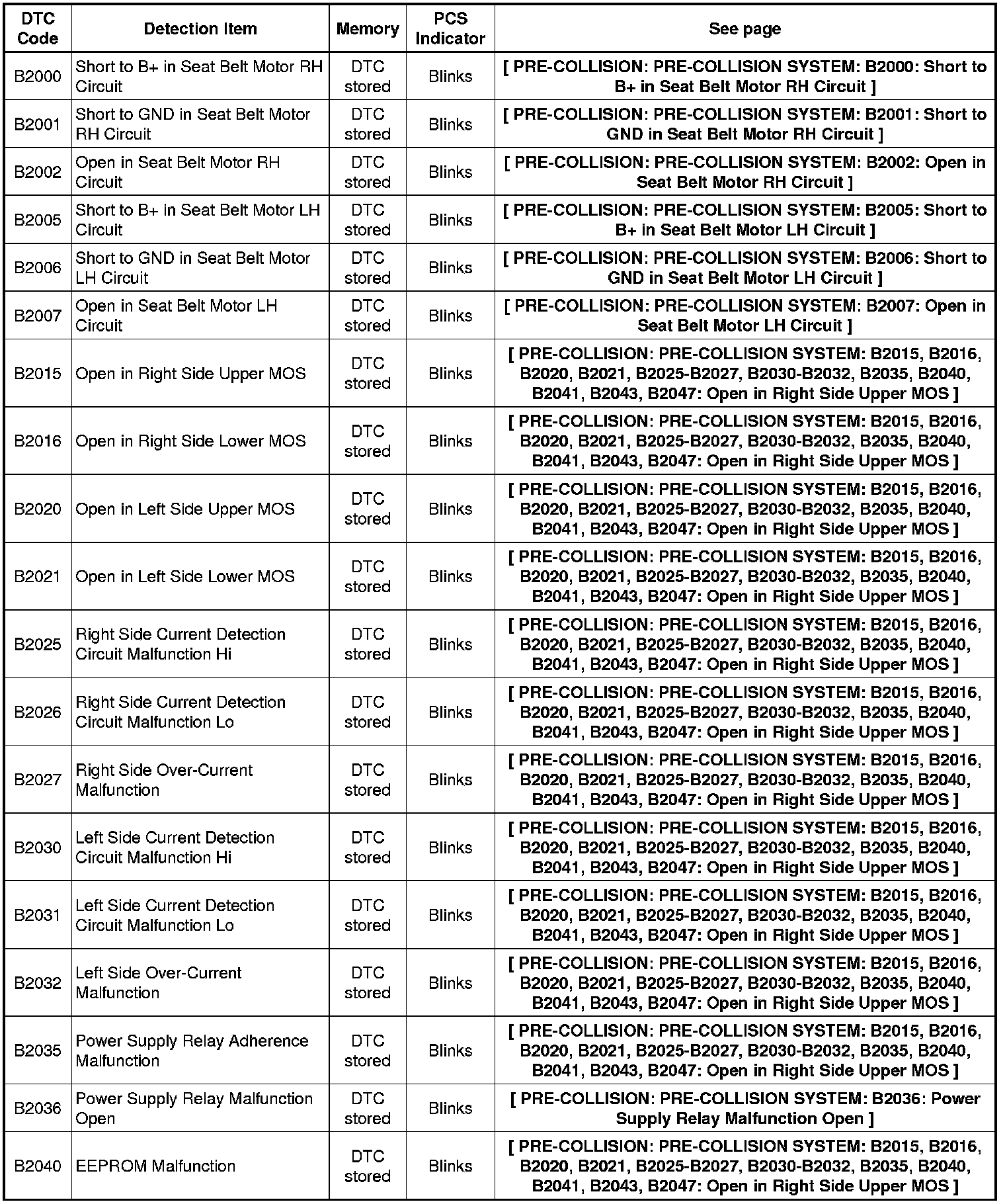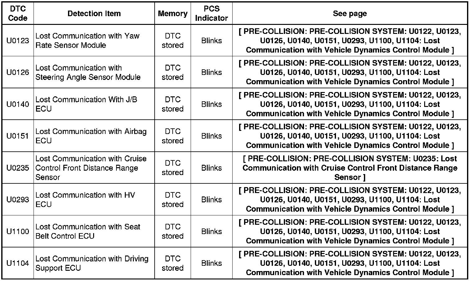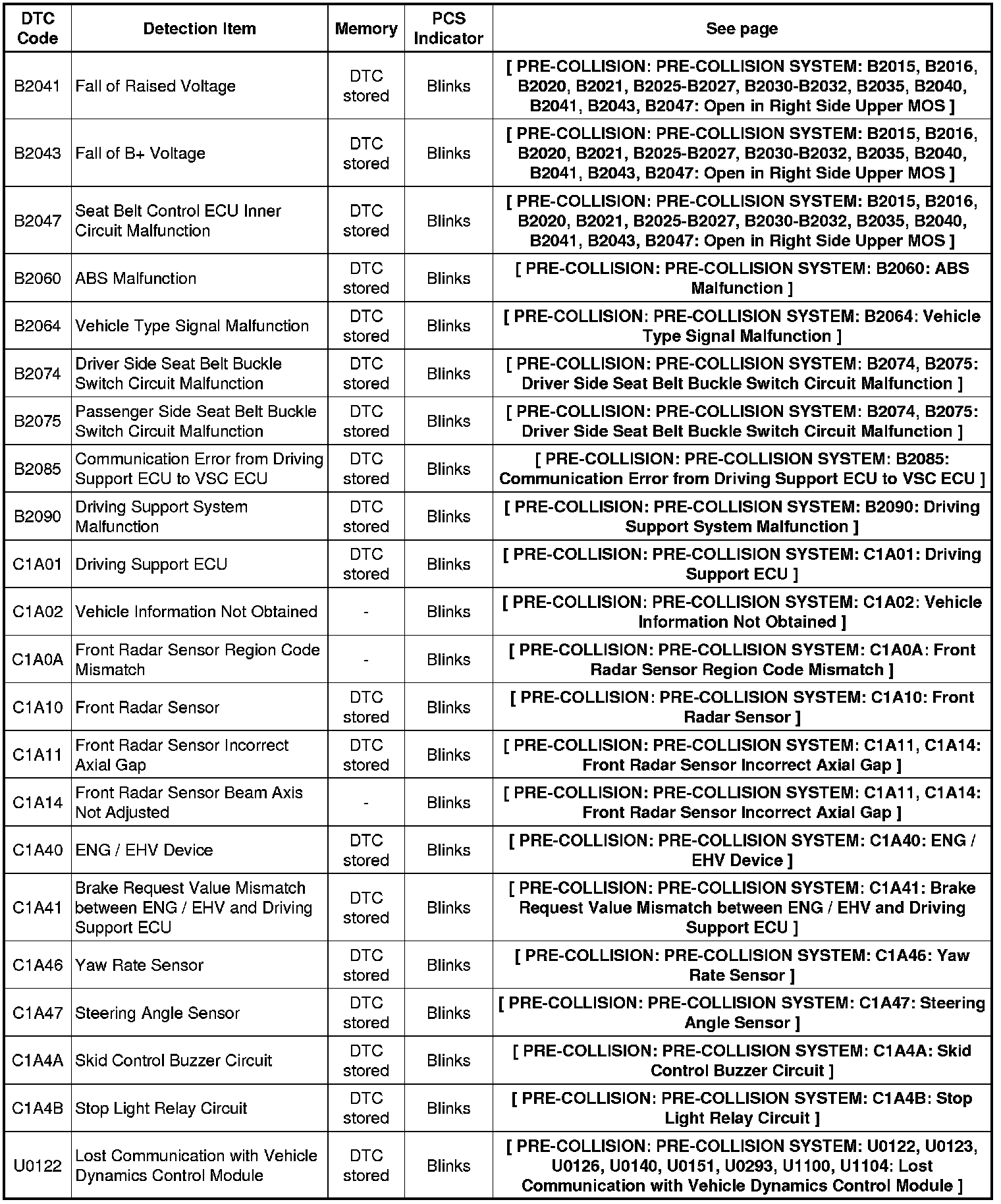 PRE-COLLISION: PRE-COLLISION SYSTEM: DIAGNOSTIC TROUBLE CODE CHART