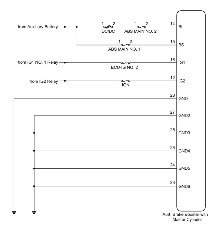 If a malfunction is detected in the power supply circuit, the skid control ECU power source voltage drops, or there is insufficient voltage to operate the ABS main relay, the skid control ECU will store these DTCs.