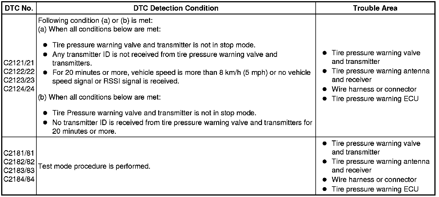 When no transmitter ID is received from a tire pressure warning valve and transmitter for a total of 20 minutes while the vehicle speed is more than 8 km/h (5 mph) or no transmitter ID is received from all the tire pressure warning valve and transmitters for a total of 20 minutes, these DTCs are set.