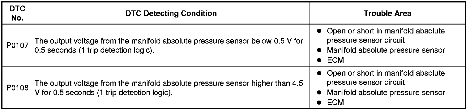 The ECM monitors the sensor voltage and uses this value to calculate the manifold absolute pressure. When the sensor output voltage deviates from the normal operating range, the ECM interprets this as a malfunction in the manifold absolute pressure sensor and stores a DTC.
