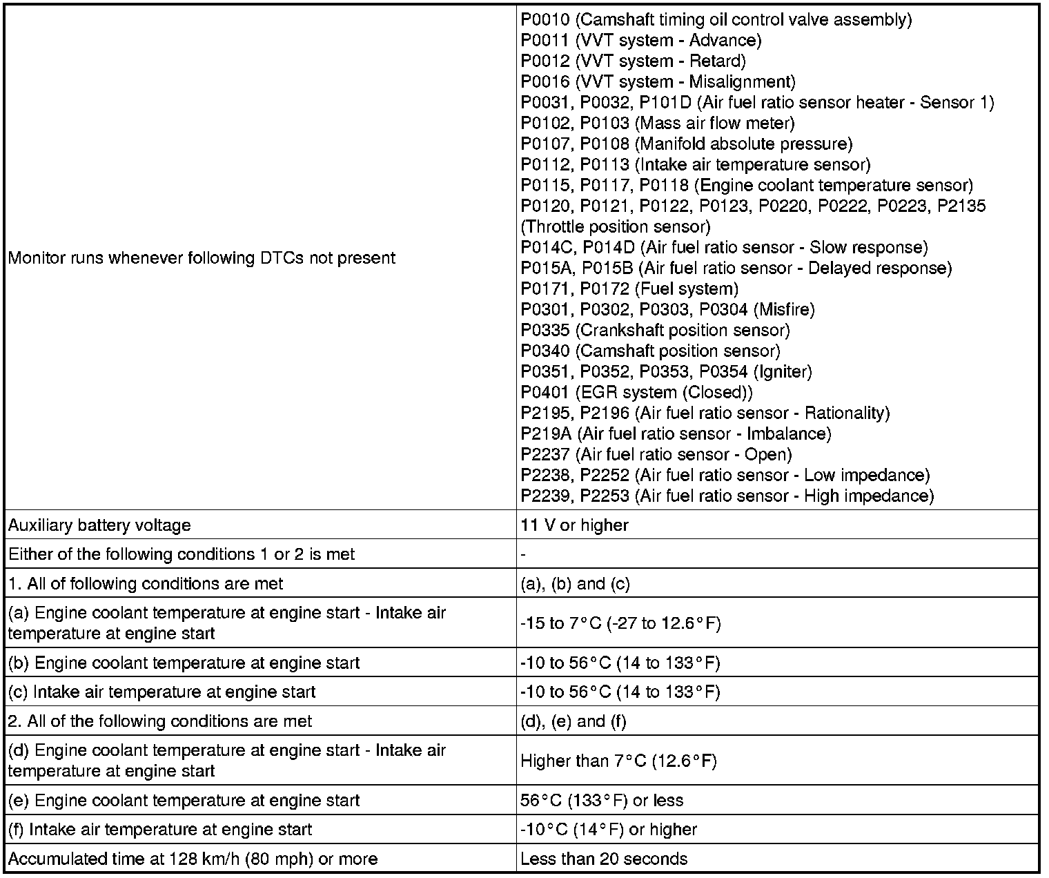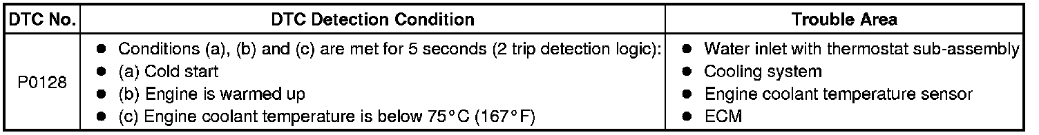 This DTC is stored when the engine coolant temperature does not reach 75°C (167°F) despite sufficient engine warm-up time having elapsed.