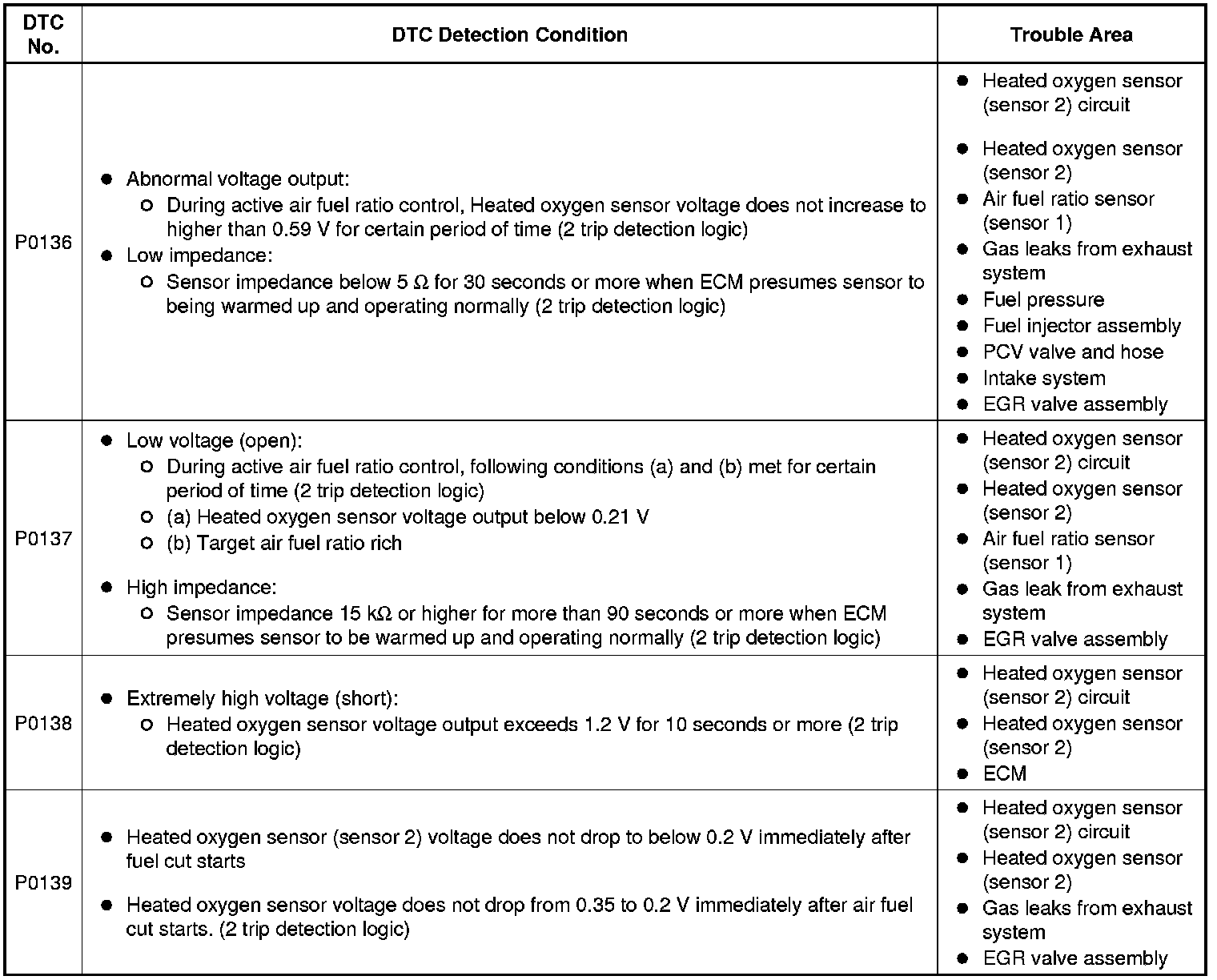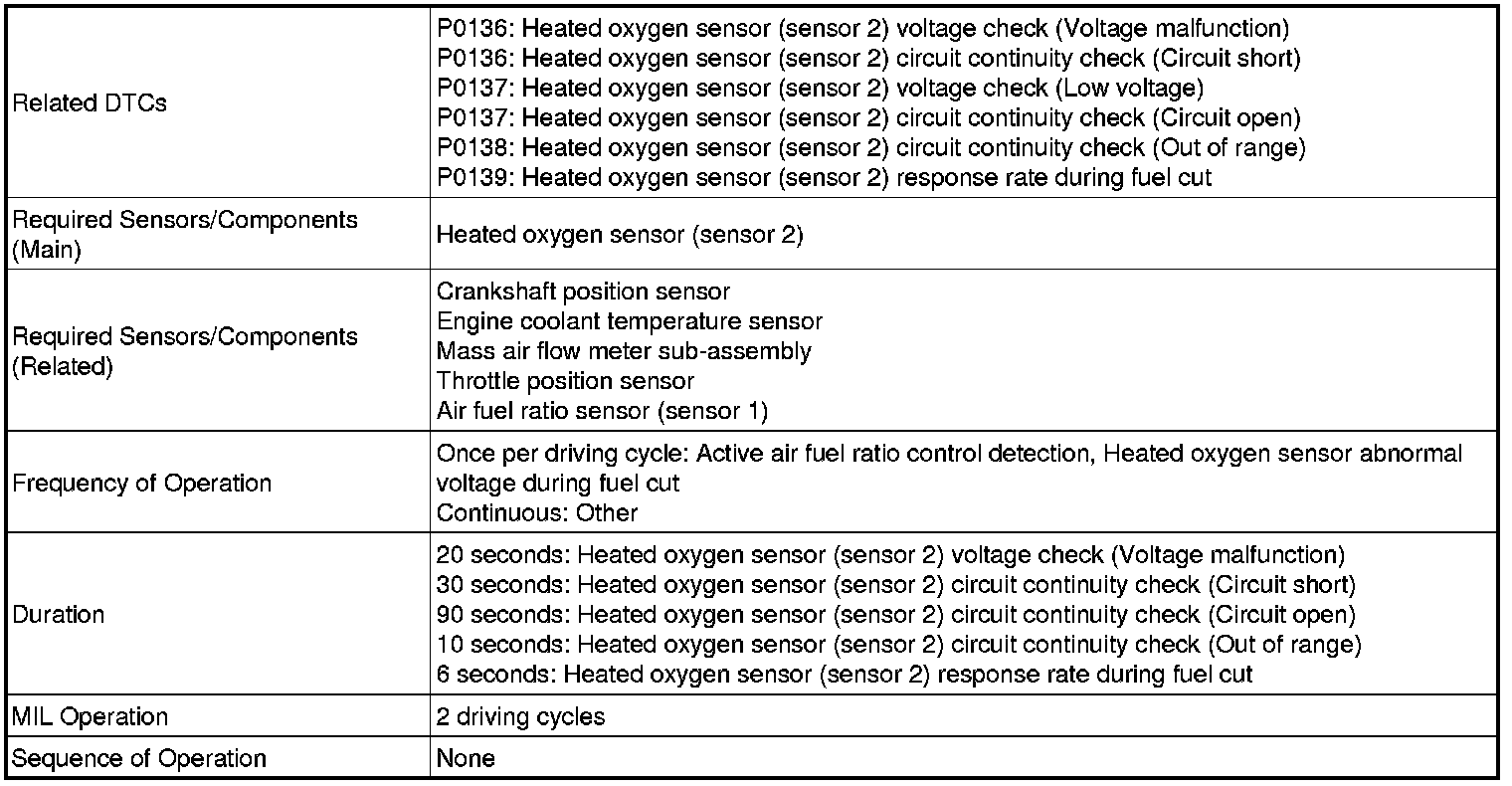 * DTC P0136 indicates the deterioration of the heated oxygen sensor. The ECM stores the DTCs by calculating the impedance of the sensor when the typical enabling conditions are satisfied (2 driving cycles).