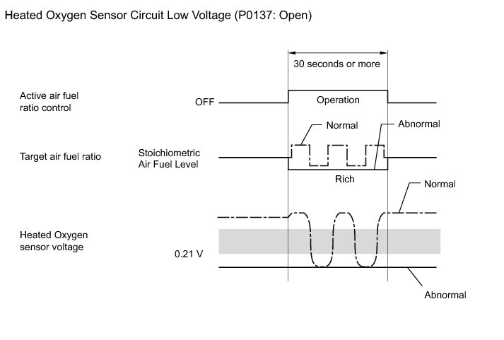 While performing active air fuel ratio control, when the target air fuel ratio is rich and the heated oxygen sensor voltage output is below 0.21 V (lean), the ECM interprets this as an abnormally low sensor output voltage and stores DTC P0137.
