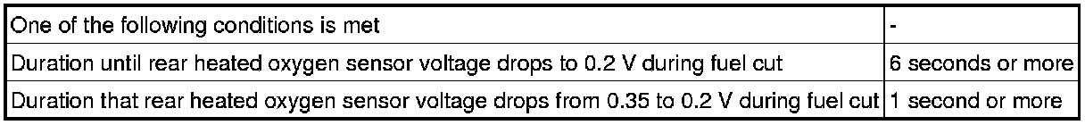 The sensor output voltage drops to below 0.2 V (extremely lean status) immediately when the vehicle decelerates and fuel cut is operating. If the voltage does not drop to below 0.2 V for 6 seconds or more, or the voltage does not drop from 0.35 to 0.2 V for 1 second or more, the ECM determines that the sensor response has deteriorated, illuminates the MIL and stores a DTC.