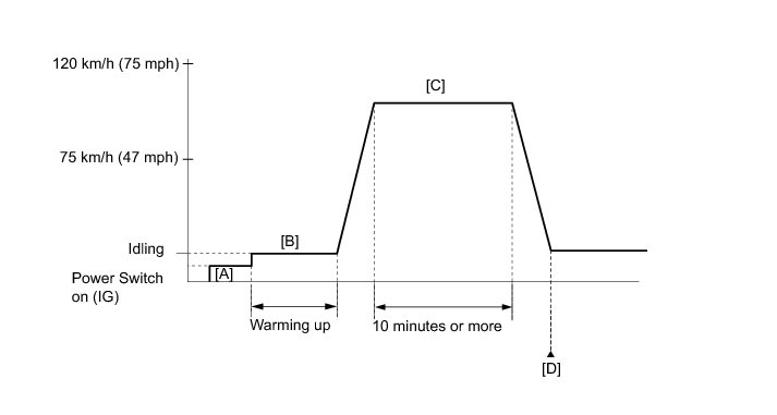 8. Drive the vehicle at 75 to 120 km/h (47 to 75 mph) for 10 minutes or more [C].