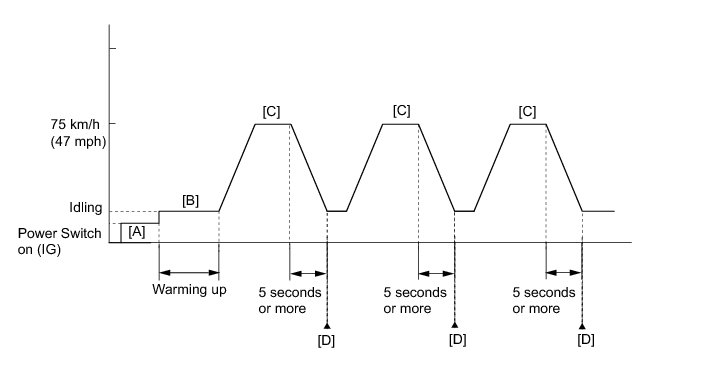 8. Drive the vehicle at 75 km/h (47 mph), and then decelerate the vehicle by releasing the accelerator pedal for 5 seconds or more to perform the fuel-cut [C].