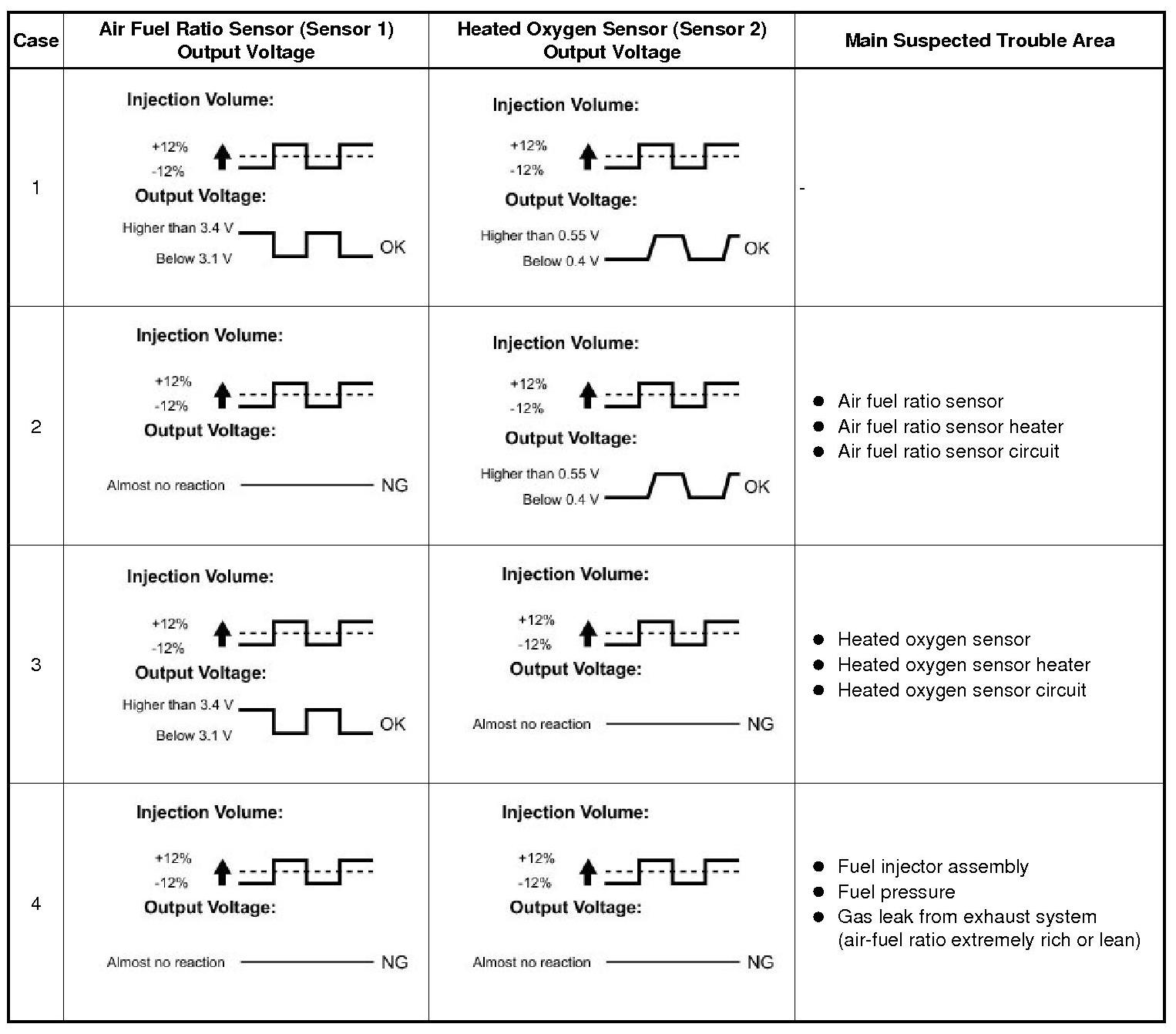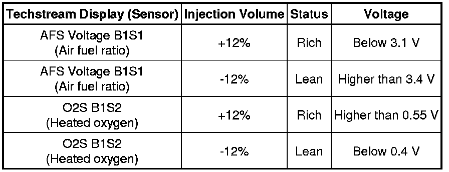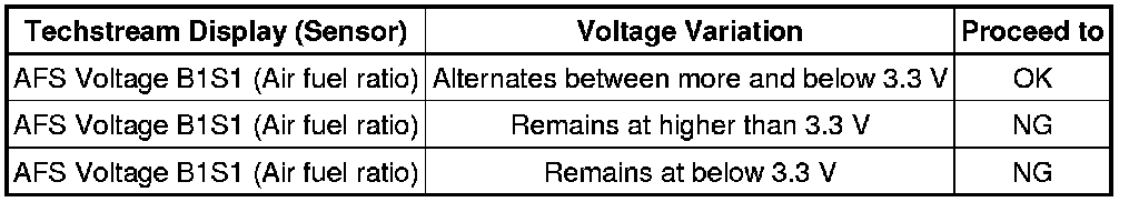 A normal heated oxygen sensor voltage (O2S B1S2) reacts in accordance with increases and decreases in fuel injection volumes. When the air fuel ratio sensor voltage remains at either below or higher than 3.3 V despite the heated oxygen sensor indicating a normal reaction, the air fuel ratio sensor is malfunctioning.