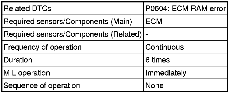 The ECM continuously monitors its internal memory status. This self-check ensures that the ECM is functioning properly. It is diagnosed by internal "mirroring" of the main CPU and sub CPU to detect Random Access Memory (RAM) errors. If outputs from these CPUs are different and deviate from the standards, the ECM will illuminate the MIL and stores the DTC immediately.