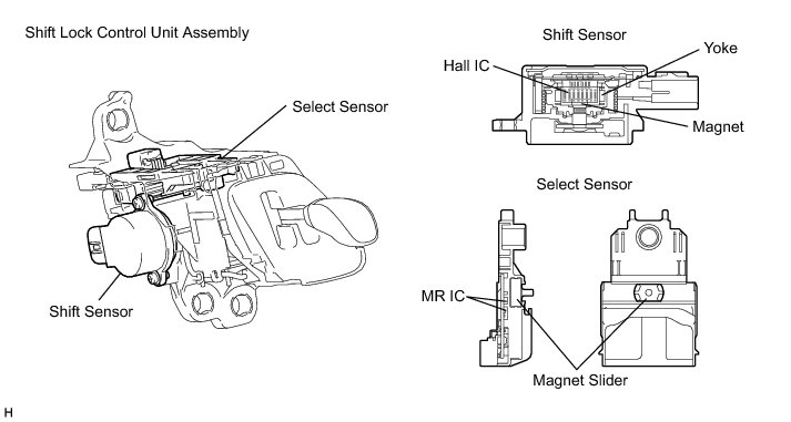 The shift lever (shift lock control unit assembly) contains a shift sensor and a select sensor to detect the shift lever position (Home, R, N, D or B). Because the shift sensor operates using Hall ICs and the select sensor operates using MR ICs, they can accurately detect the shift lever position in a reliable manner. Both sensors contain two detection circuits, a main and a sub circuit.