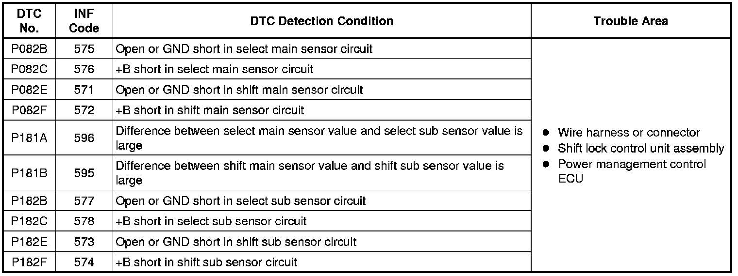 When any of DTCs P082B-575, P082C-576, P182B-577 or P182C-578 are output, check Shift Sensor Select Main and Shift Sensor Select Sub voltages using the Techstream.