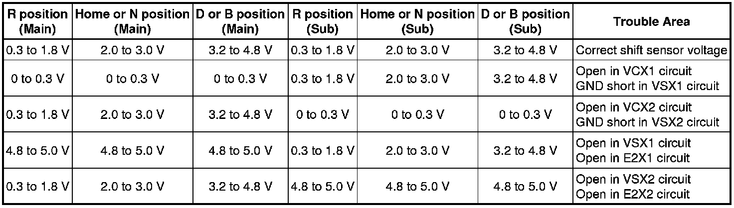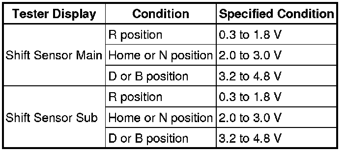 When any of DTCs P082E-571, P082F-572, P182E-573 or P182F-574 are output, check Shift Sensor Main and Shift Sensor Sub voltages using the Techstream.
