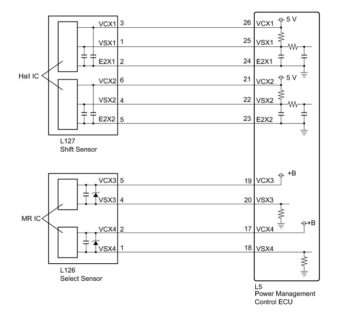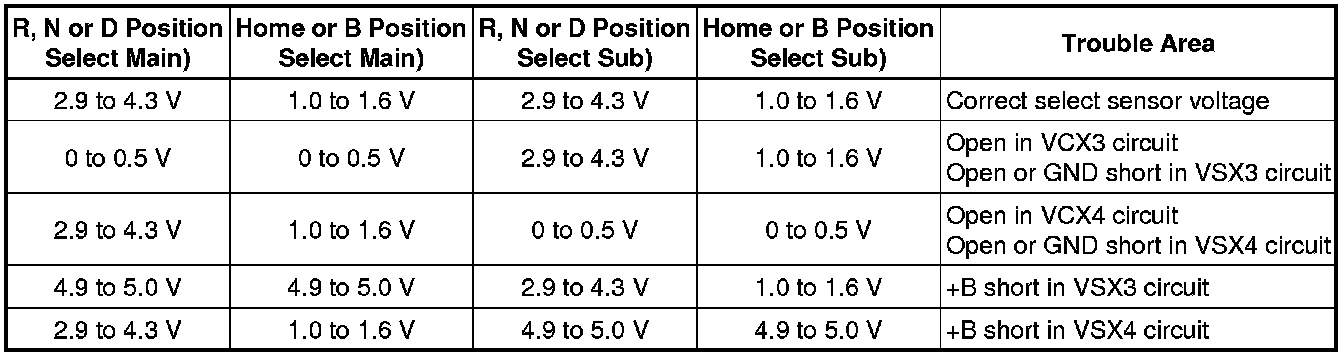 - The select sensor outputs voltage, which varies between 0 and 5 V in accordance with the horizontal movement of the shift lever, to the power management control ECU (HV CPU). The power management control ECU (HV CPU) interprets low level voltage input from the select sensor as the home or B position, and high level voltage as the R, N, or D position.