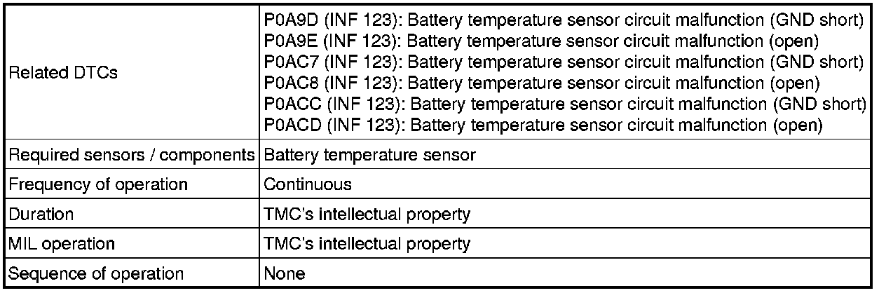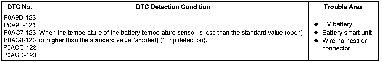 HYBRID / BATTERY CONTROL: HYBRID BATTERY SYSTEM: P0A9D-123, P0A9E-123, P0AC7-123, P0AC8-123, P0ACC-123, P0ACD-123: Hybrid Battery Temperature Sensor "A" Circuit Low