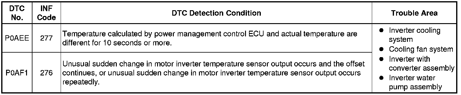 P0AEE-277 or P0AF1-276 may be set due to a malfunction which also causes DTCs in the preceding table to be set. In this case, first troubleshoot the output DTCs in the preceding table. Then, perform a test to attempt to reproduce the problems, and check that no DTCs are output.