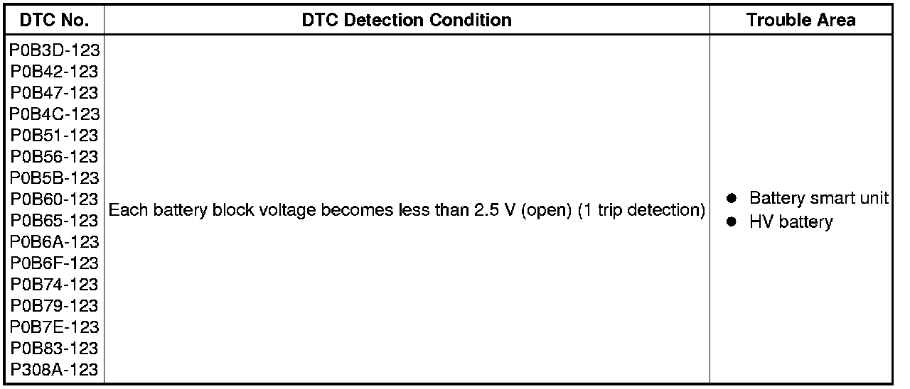 HYBRID / BATTERY CONTROL: HYBRID BATTERY SYSTEM: P0B3D-123, P0B42-123, P0B47-123, P0B4C-123, P0B51-123, P0B56-123, P0B5B-123, P0B60-123, P0B65-123, P0B6A-123, P0B6F-123, P0B74-123, P0B79-123, P0B7E-123, P0B83-123, P308A-123: Hybrid Battery Voltage Sensor "A" Circuit Low