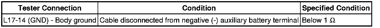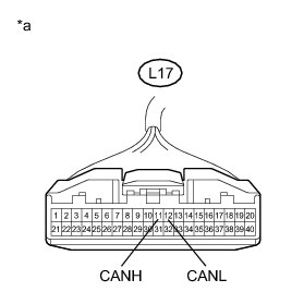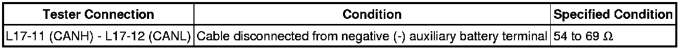 * Before measuring the resistance of the CAN bus, turn the power switch off and leave the vehicle for 1 minute or more without operating the key, switches or opening or closing the doors. After that, disconnect the cable from the negative (-) auxiliary battery terminal and leave the vehicle for 1 minute or more before measuring the resistance.