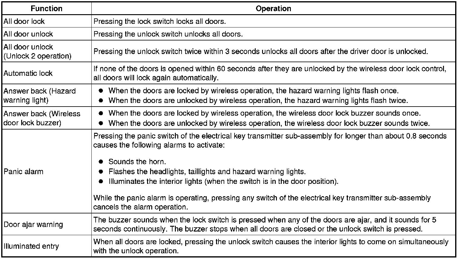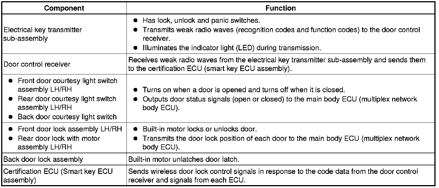 The wireless door lock control system can be used to lock and unlock all doors from a distance. The system is controlled by a electrical key transmitter sub-assembly which sends radio waves to the door control receiver. The certification ECU (smart key ECU assembly) performs an ID code identification process and engages the door lock control.