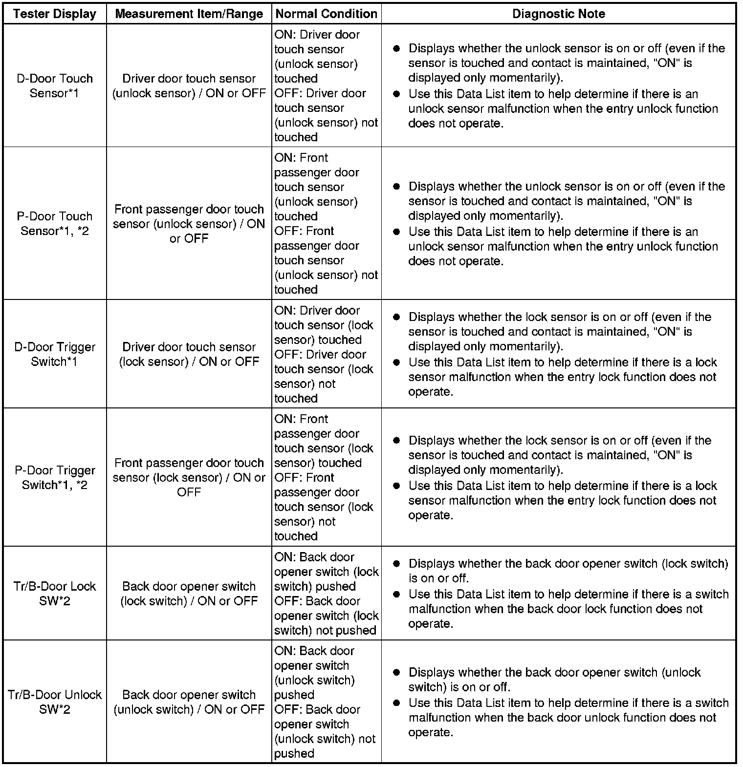 * *3: With power switch off, all doors closed, electrical key transmitter sub-assembly not inside vehicle and all doors unlocked, front door outside handle assembly (lock sensor) touched.