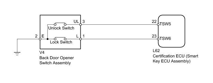 If the entry lock function does not operate for the back door only, but the entry unlock function operates, the request code is being transmitted properly from the back door. In this case, there may be a problem related to the lock switch (connection between the back door opener switch assembly and certification ECU (smart key ECU assembly)).