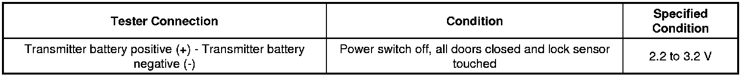 * When measuring the transmitter battery voltage, while operating the lock sensor of a door handle, bring the electrical key transmitter sub-assembly within the entry operating range to perform the measurement. For the entry operating range, refer to System Description System Description.