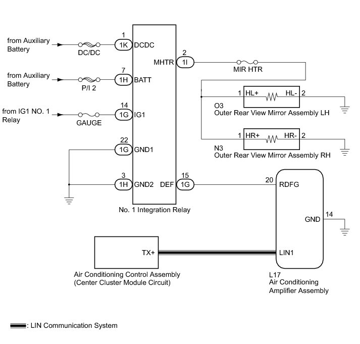 When the mirror heater switch (rear window defogger switch) on the air conditioning control assembly (center cluster module circuit) is pressed, the operation signal is transmitted to the air conditioning amplifier assembly through a LIN communication line. When the air conditioning amplifier assembly receives the signal, it turns on the No. 1 integration relay to operate the mirror heater.
