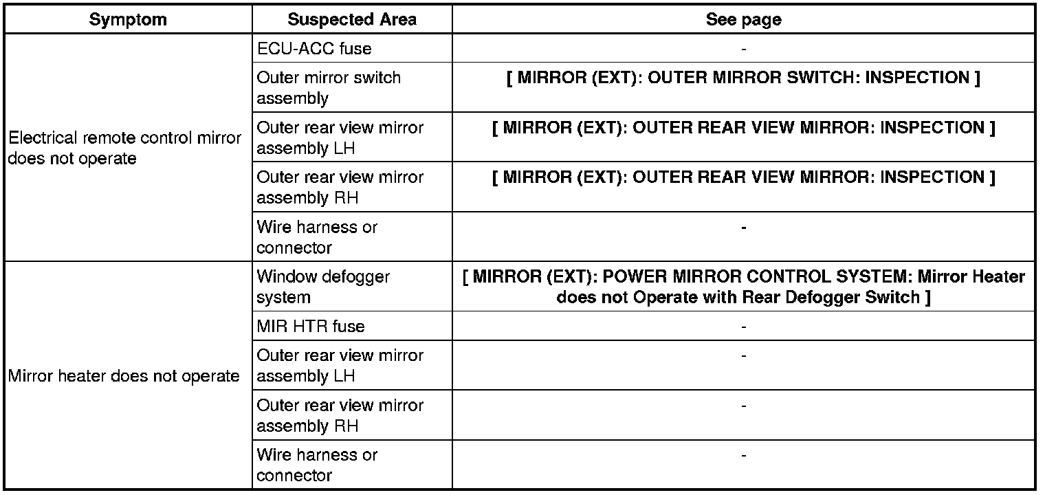 MIRROR (EXT): POWER MIRROR CONTROL SYSTEM: PROBLEM SYMPTOMS TABLE