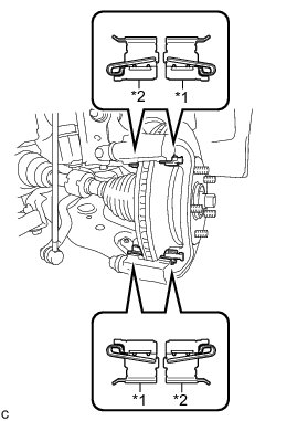 (a) Install the 2 front No. 1 disc brake pad support plates and 2 front No. 2 disc brake pad support plates to the front disc brake cylinder mounting.