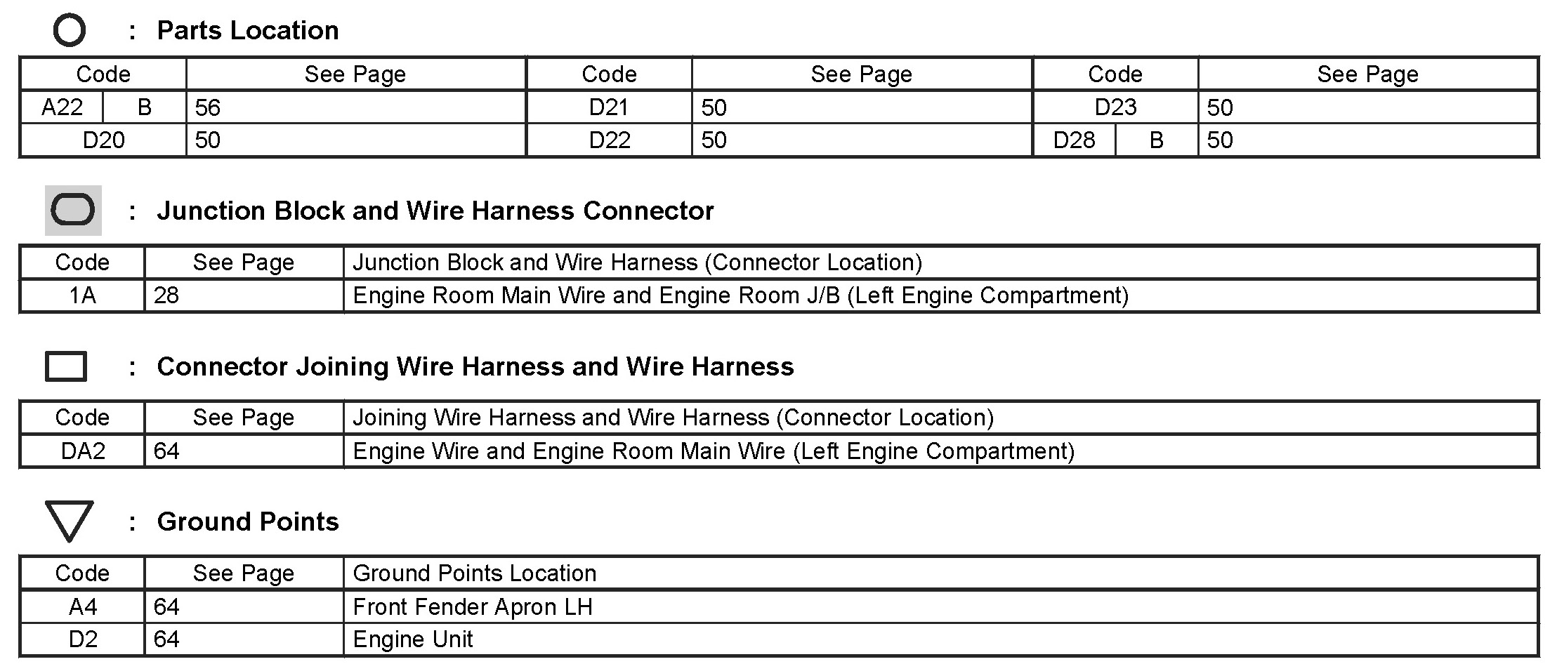 Locations: The locations of components, connectors, ground points, and splices referred to within these diagrams can be found at Vehicle Locations. Locations