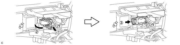 (b) Rotate the handle of the service plug grip 90° toward the battery and slide it in the direction shown by the arrow until a click sound is heard.