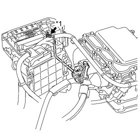 (a) Before inspecting the high-voltage system or disconnecting the low voltage connector of the inverter with converter assembly, take safety precautions such as wearing insulated gloves and removing the service plug grip to prevent electrical shocks. After removing the service plug grip, put it in your pocket to prevent other technicians from accidentally reconnecting it while you are working on the high-voltage system.
