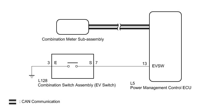 The EV mode signal is sent to the power management control ECU (HV CPU). This signal is then transmitted from the power management control ECU (HV CPU) via CAN to the combination meter sub-assembly to illuminate the EV indicator lamp.