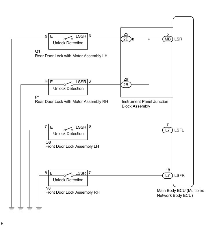 The main body ECU (multiplex network body ECU) detects the condition of each door unlock detection switch.