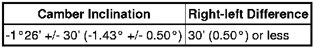 Camber is not adjustable. If the measurement is not within the specified range, inspect the suspension parts for damage and/or wear, and replace them if necessary.