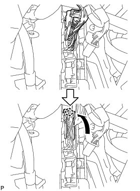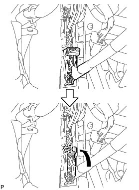 (d) Engage the 2 claws to connect the wiring harness protector.