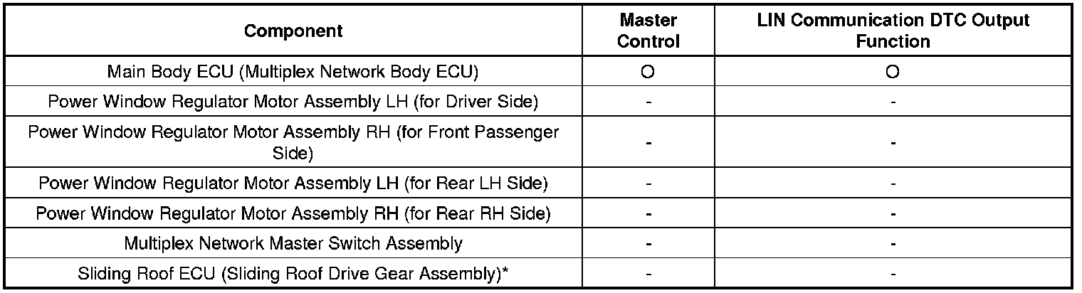 The LIN communication system is used for communication between the components in the tables below. If communication cannot be performed through LIN communication because of an open in the communication lines or other reasons, the master control ECU of the relevant system will store a DTC. Refer to the table below about the communication bus lines and connected components.