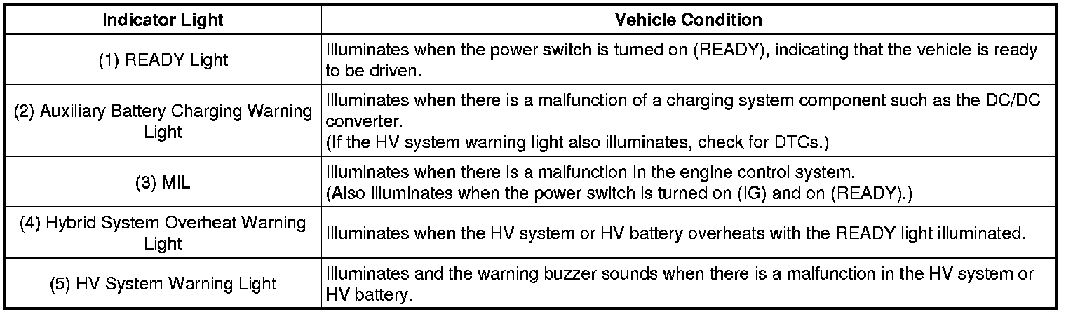 (a) If one of the warning lights (2) to (5) illuminates, connect the Techstream to the DLC3 to check the DTCs (Diagnostic Trouble Codes). Then, refer to the applicable troubleshooting steps in this manual to inspect and repair the affected area. The foregoing actions are also required if the READY light does not illuminate when attempting to turn the power switch on (READY).