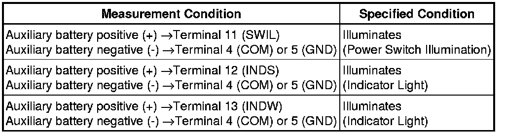 (b) Apply auxiliary battery voltage between the terminals of the switch, and check the illumination condition of the power switch.