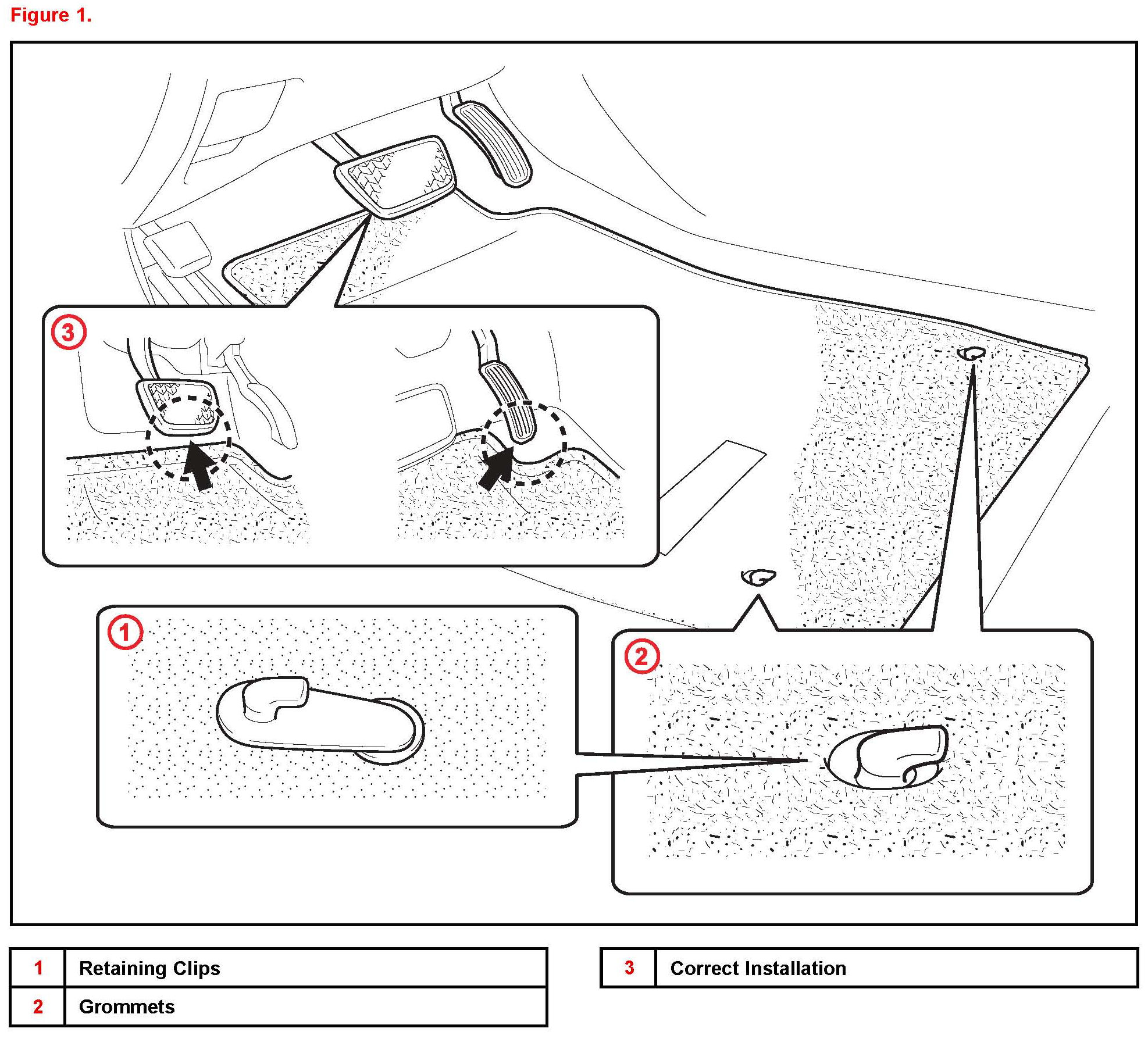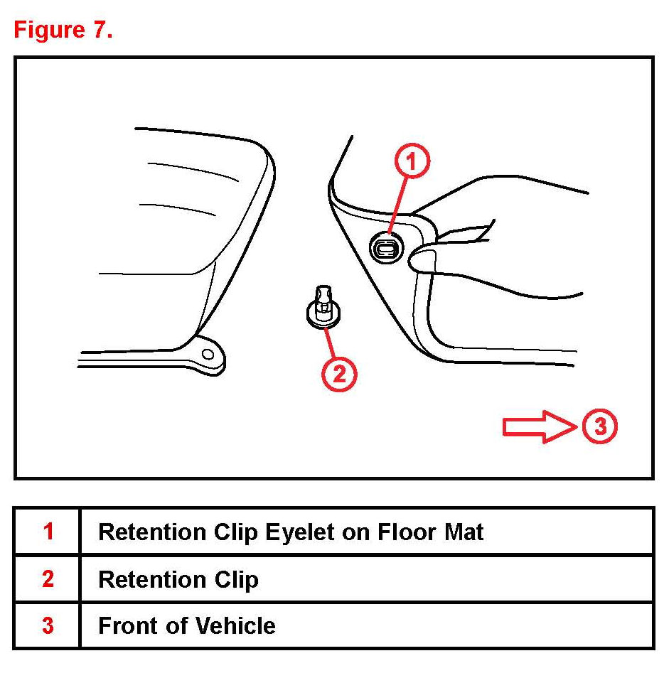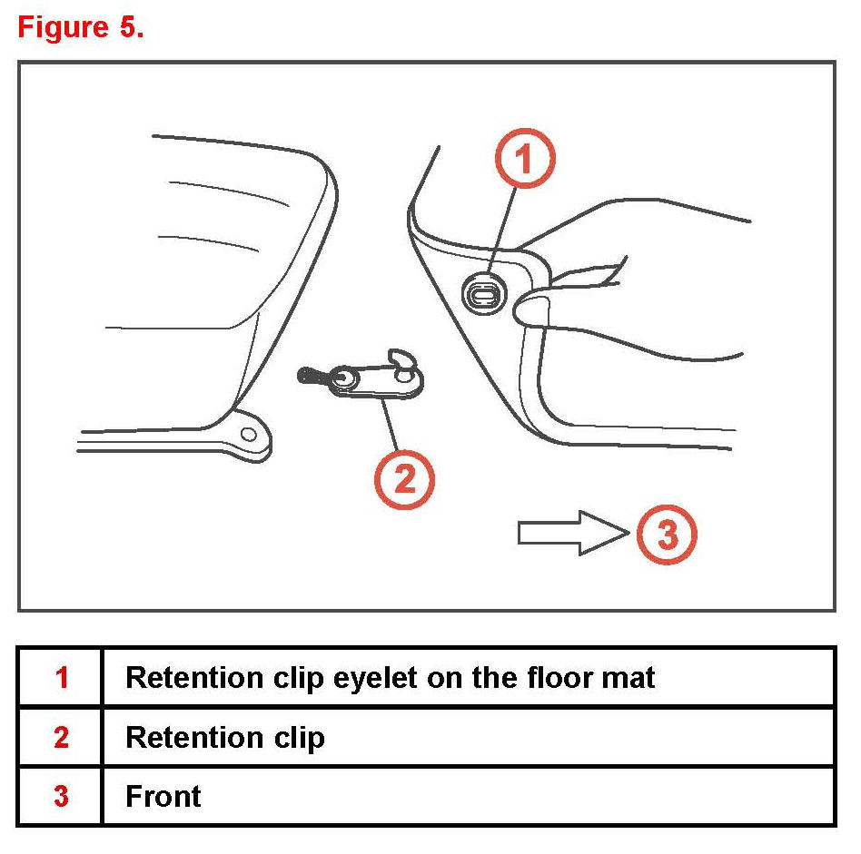 2012 model year vehicles are equipped with driver's side floor mat retaining clips to secure the floor mat in the correct position. In addition, some models may utilize retaining clips for passenger side floor mats as well. Follow the appropriate installation procedure to attach the driver's side and passenger 5 side (if applicable) floor mat to the vehicle carpet using the floor mat retaining clips during Pre-Delivery Service (PDS).