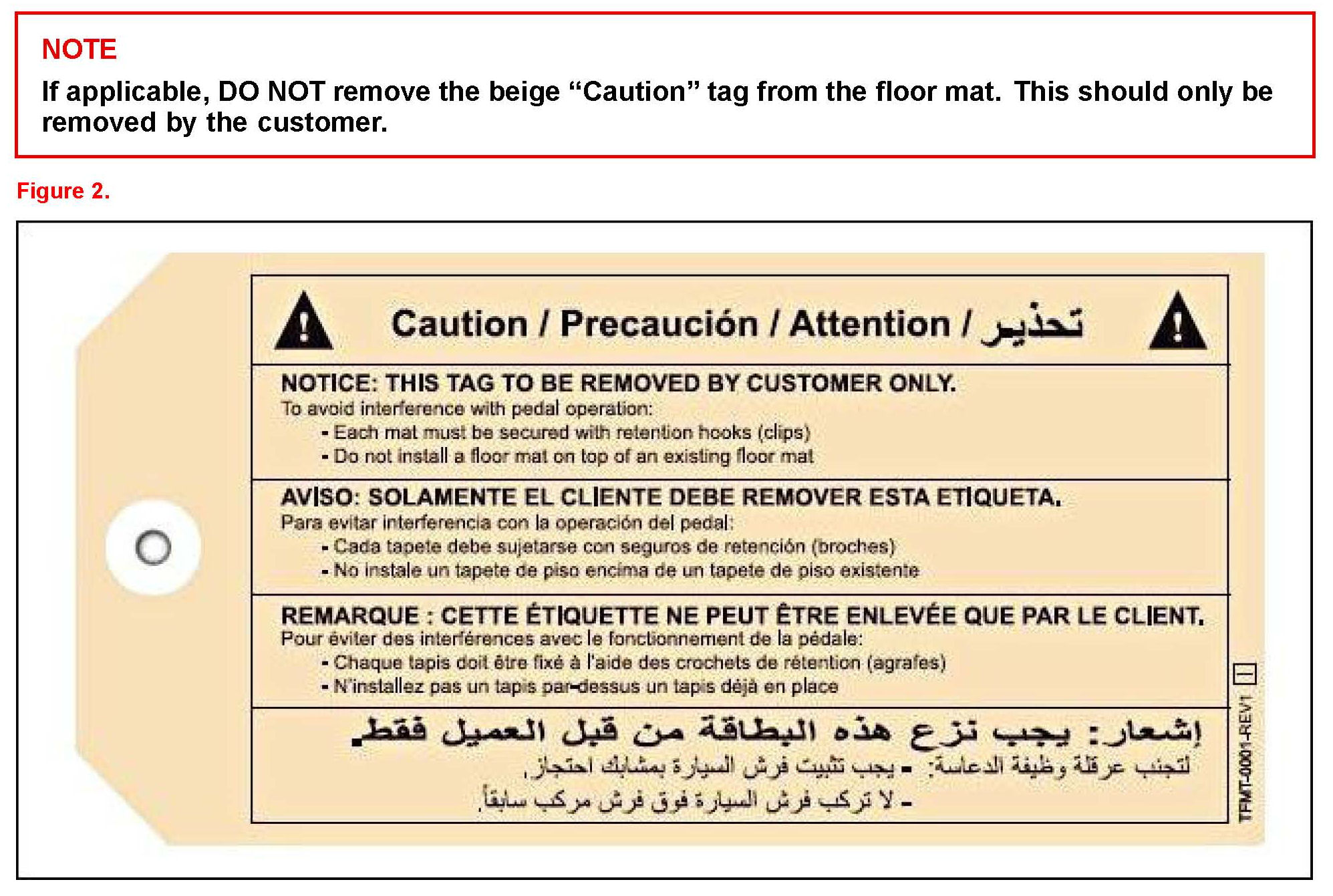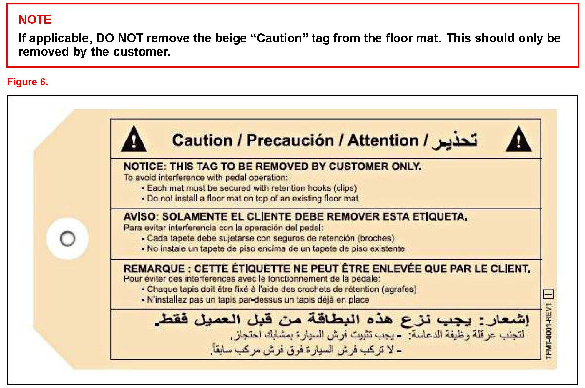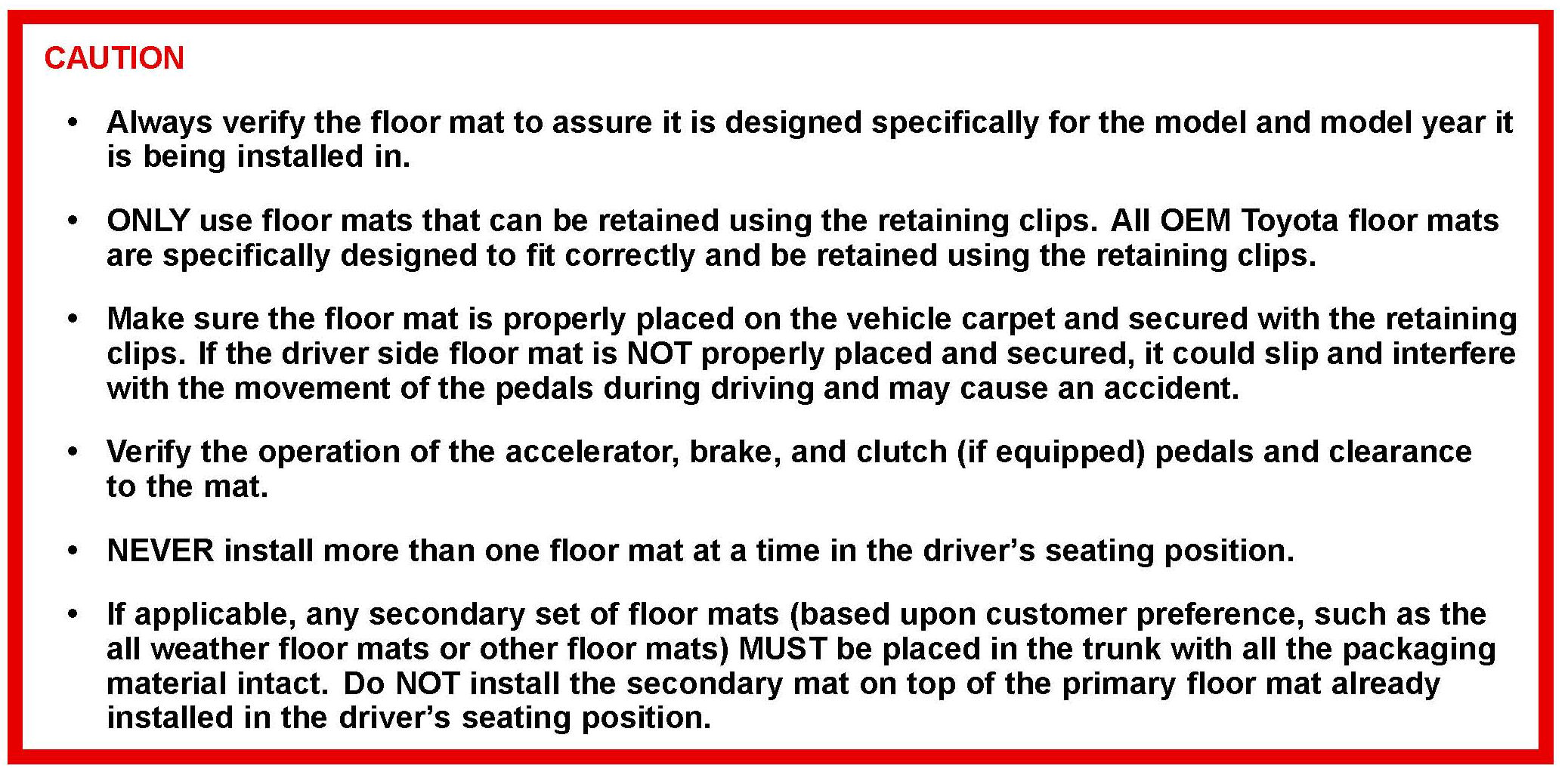 2012 model year vehicles are equipped with driver's side floor mat retaining clips to secure the floor mat in the correct position. In addition, some models may utilize retaining clips for passenger side floor mats as well. Follow the appropriate installation procedure to attach the driver's side and passenger 5 side (if applicable) floor mat to the vehicle carpet using the floor mat retaining clips during Pre-Delivery Service (PDS).