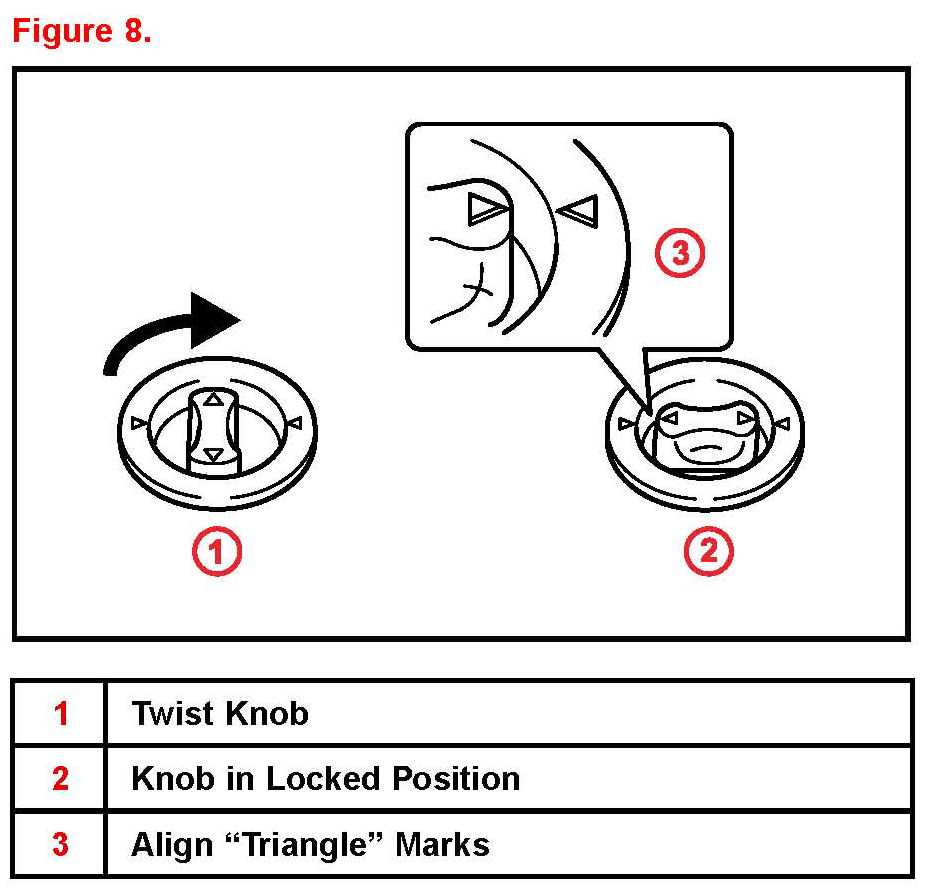 3. Turn the retention clip knobs a quarter of a turn to lock in place and verify the "triangle" marks on the retention clip knobs and floor mat are aligned.