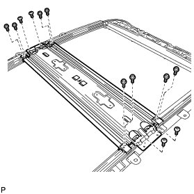 (b) Using a T20 "TORX" socket wrench, remove the 4 "TORX" screws and sunshade trim sub-assembly from the slide roof rail sub-assembly.