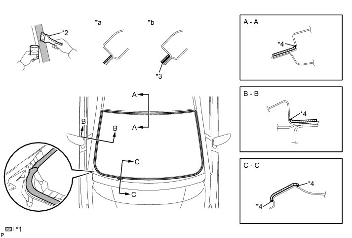 (b) Install the windshield outside sub moulding onto the windshield glass, as shown in the illustration.