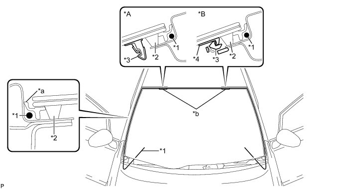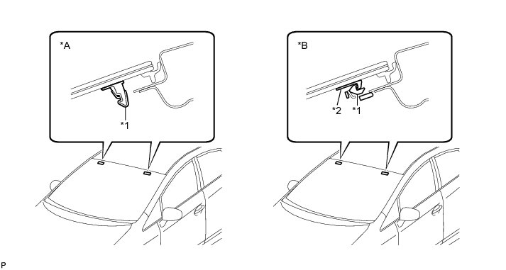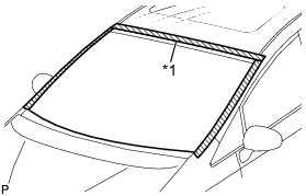 * There are No. 1 and No. 2 stoppers on the windshield glass as shown in the illustration. Be careful not to damage the windshield glass when cutting off the adhesive.