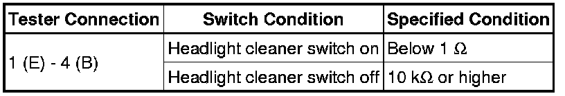 If the result is not as specified, replace the headlight cleaner switch assembly.