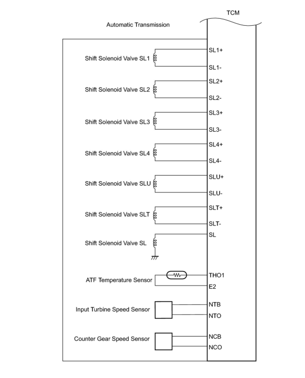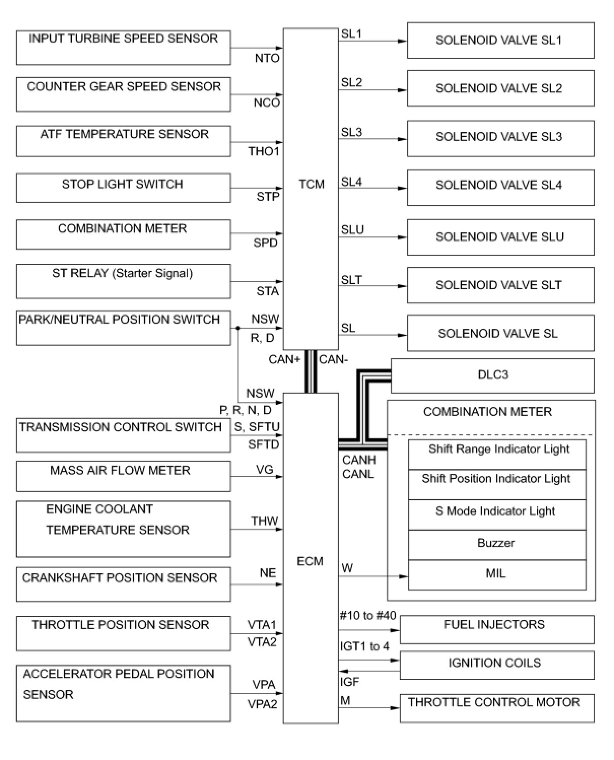 The configuration of the electronic control system in the U760F automatic transaxle is as shown in the following chart.