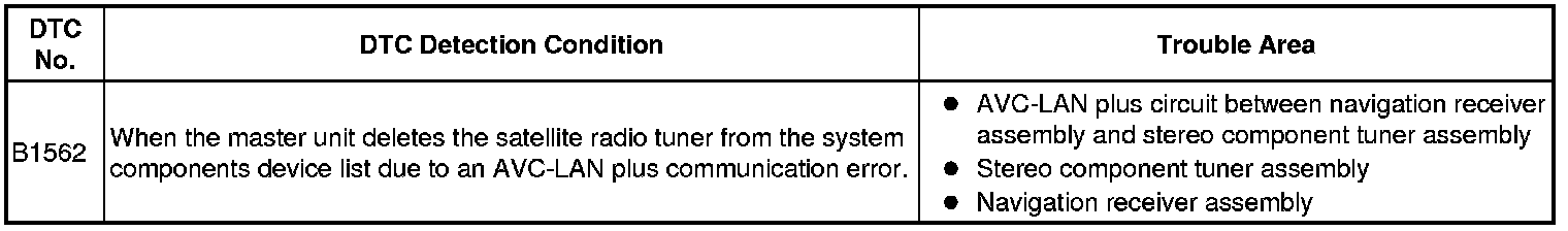 When an AVC-LAN plus communication error occurs between the navigation receiver assembly and stereo component tuner assembly, this DTC will be stored.