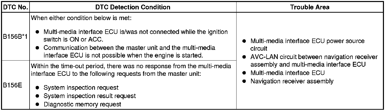When an AVC-LAN communication error occurs between the navigation receiver assembly and multi-media interface ECU, these DTCs will be stored.